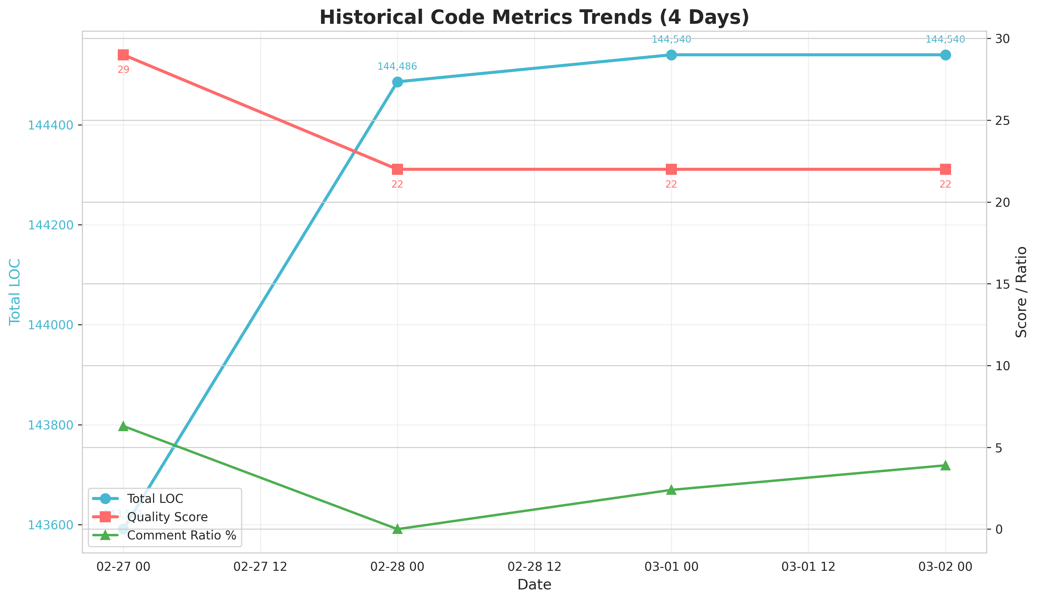 Total LOC has been stable at ~144,540 for the past 3 days (up from 143,591 on Feb 27). Quality score dropped from 29 → 22 between Feb 27 and Feb 28 and has held steady since. Comment ratio improved from 0% → 3.9% over the tracked period.