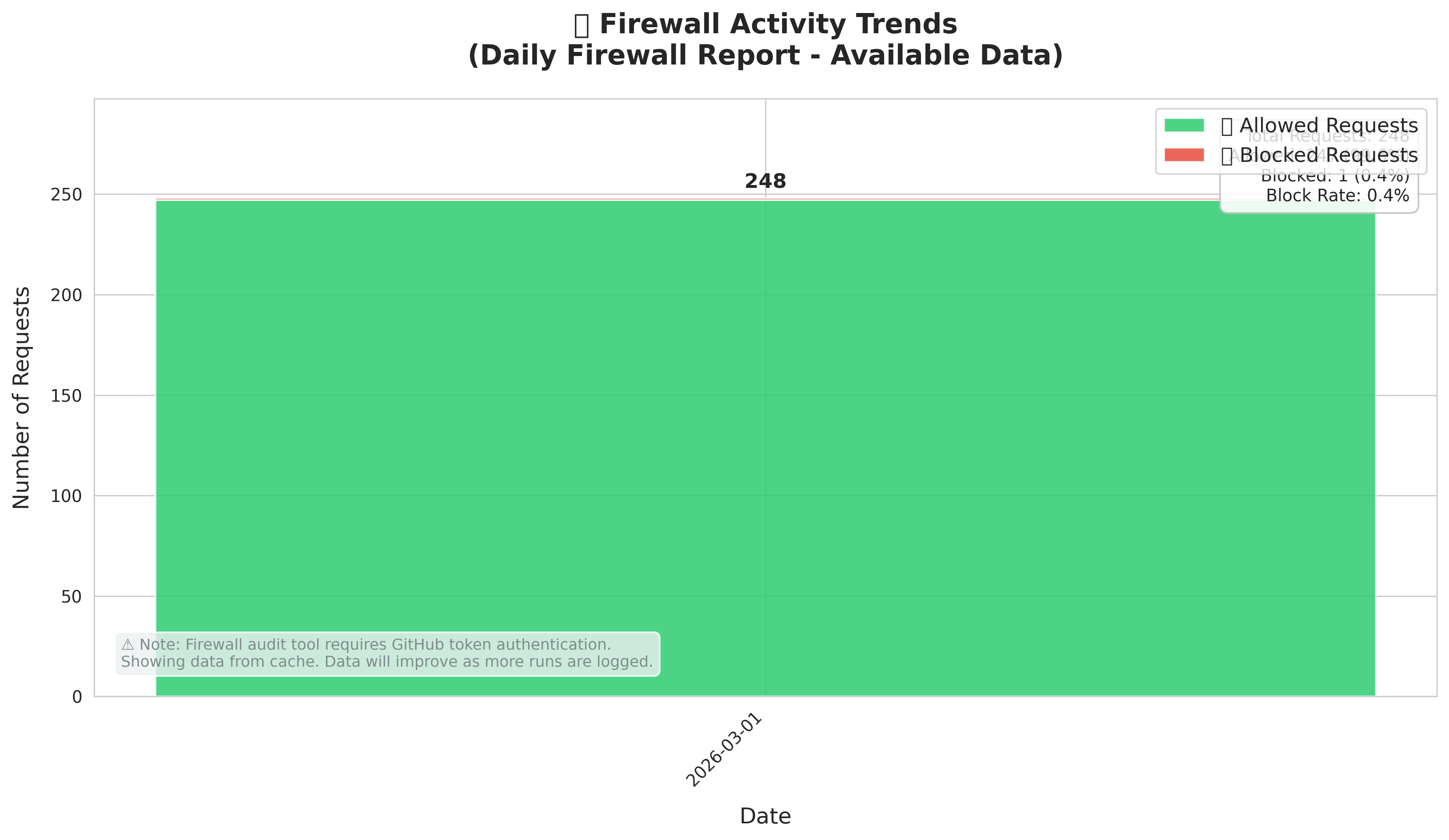 30 workflow runs were observed across the repository today. All 85 configured agentic workflows use the Squid proxy firewall with a curated domain allowlist. The most recent complete firewall dataset is from 2026-03-01, which showed an extremely low block rate of 0.4% — 1 blocked request out of 248 total. The one observed blocked domain (