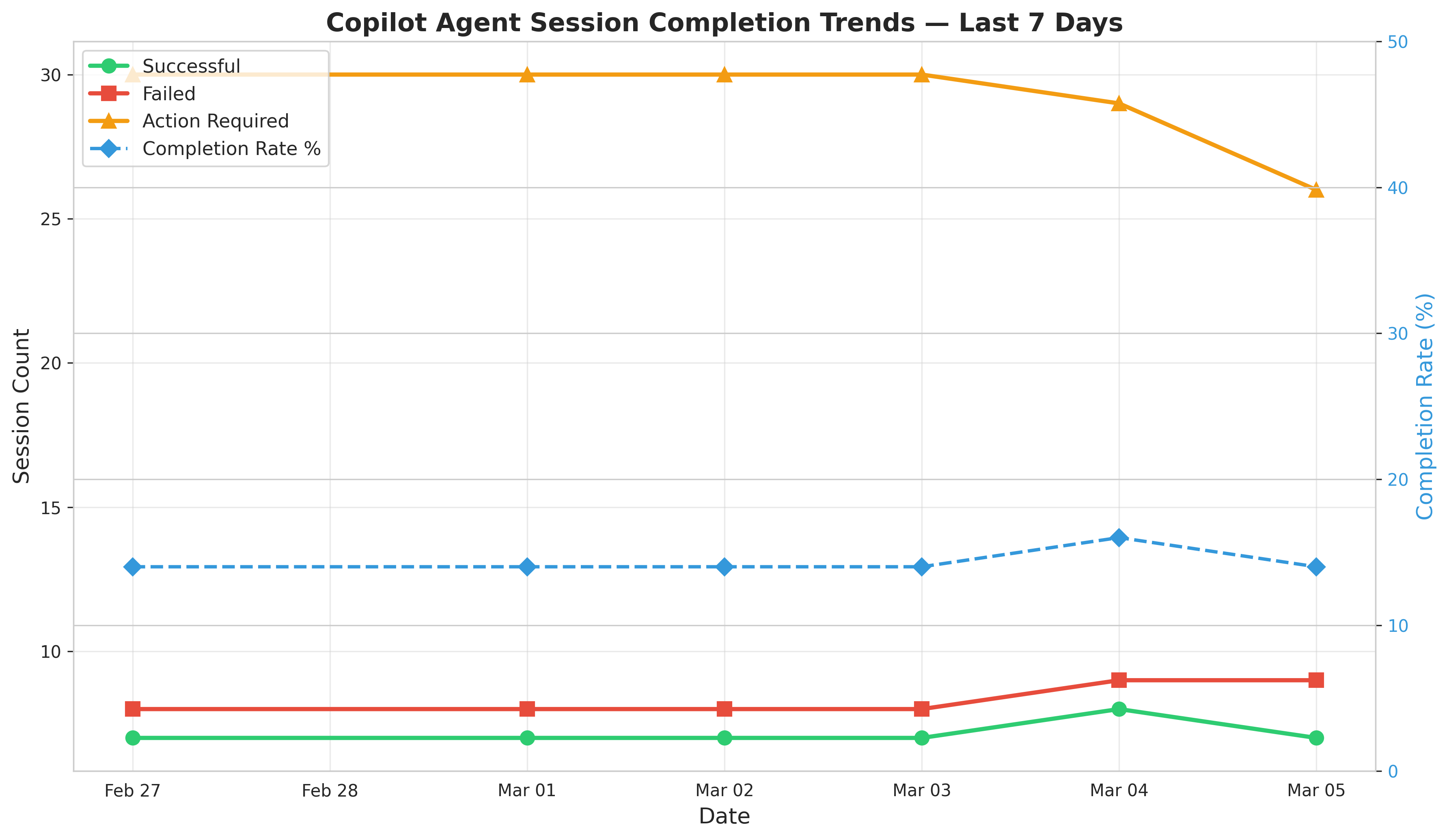 copilot/set-up-unity-test-framework) emerged today with 5 in-flight sessions. The dominant pattern remainsaction_requiredat 52% of sessions, with direct success stable at 14%. Conversation log behavioral analysis remains blocked pending OAuth token setup.Key Metrics