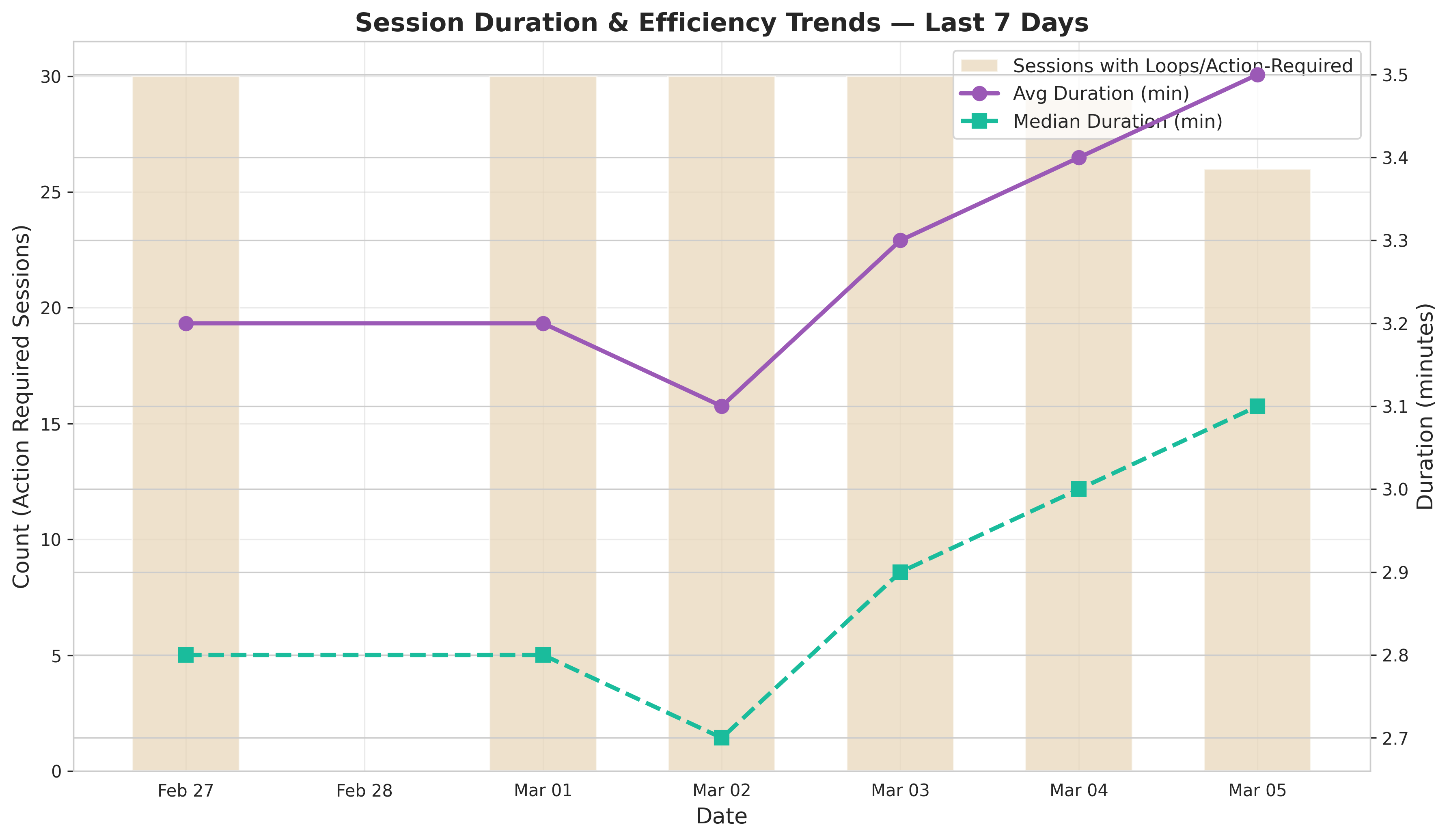 Average session durations are creeping upward (3.2 → 3.5 min), consistent with expanding scope of tasks and new branches. The number of sessions in the action-required/loop state has decreased modestly from 30 to 26, but this likely reflects in-progress rather than resolved sessions. Efficiency remains limited by the persistent CI/CD failures on Unity Build workflows.
