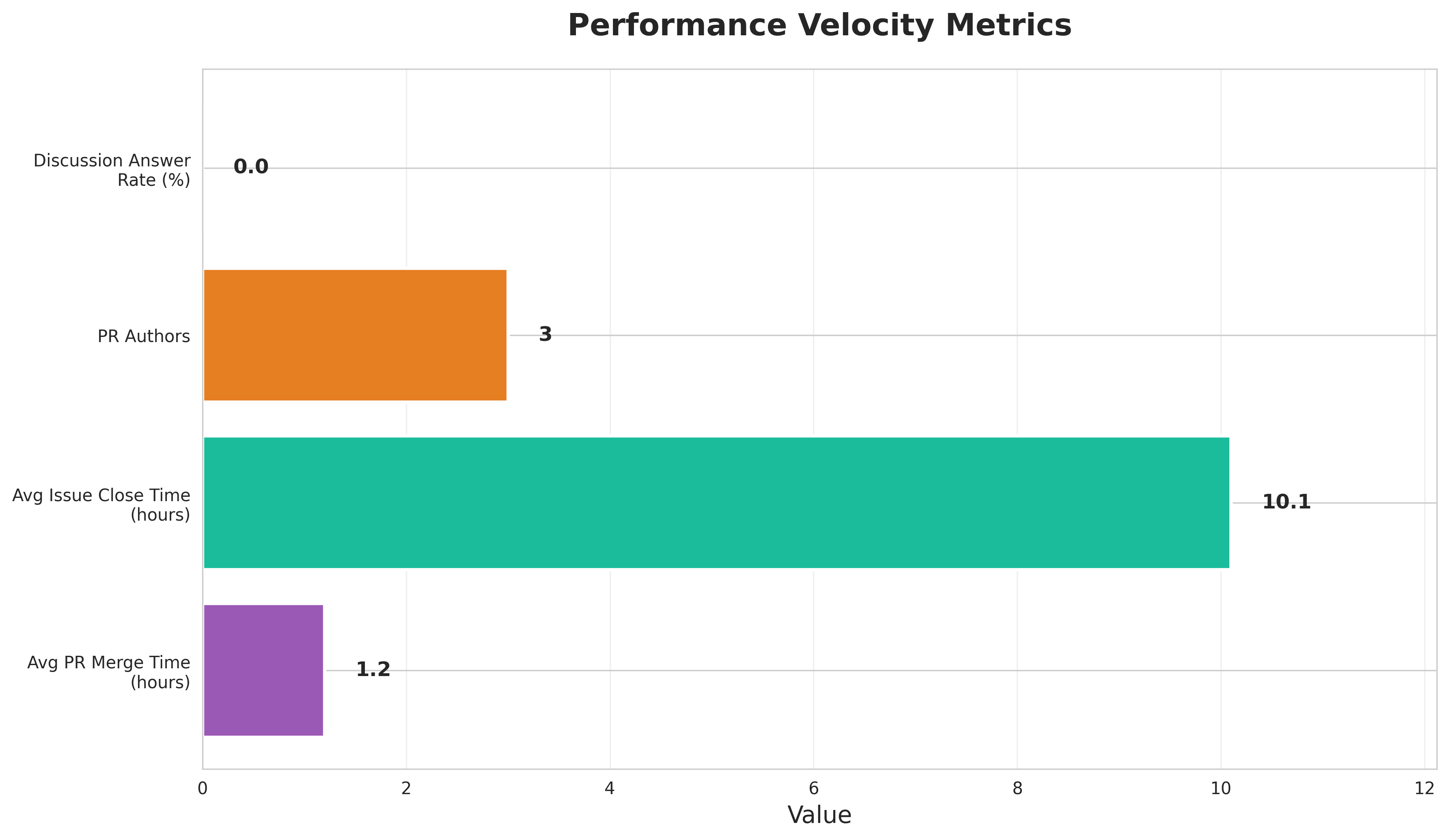 The 1.2-hour average PR merge time is a standout strength of this project. Issue close time at 10.1 hours is reasonable for the items being addressed. Contributor diversity remains low at 3 unique authors.