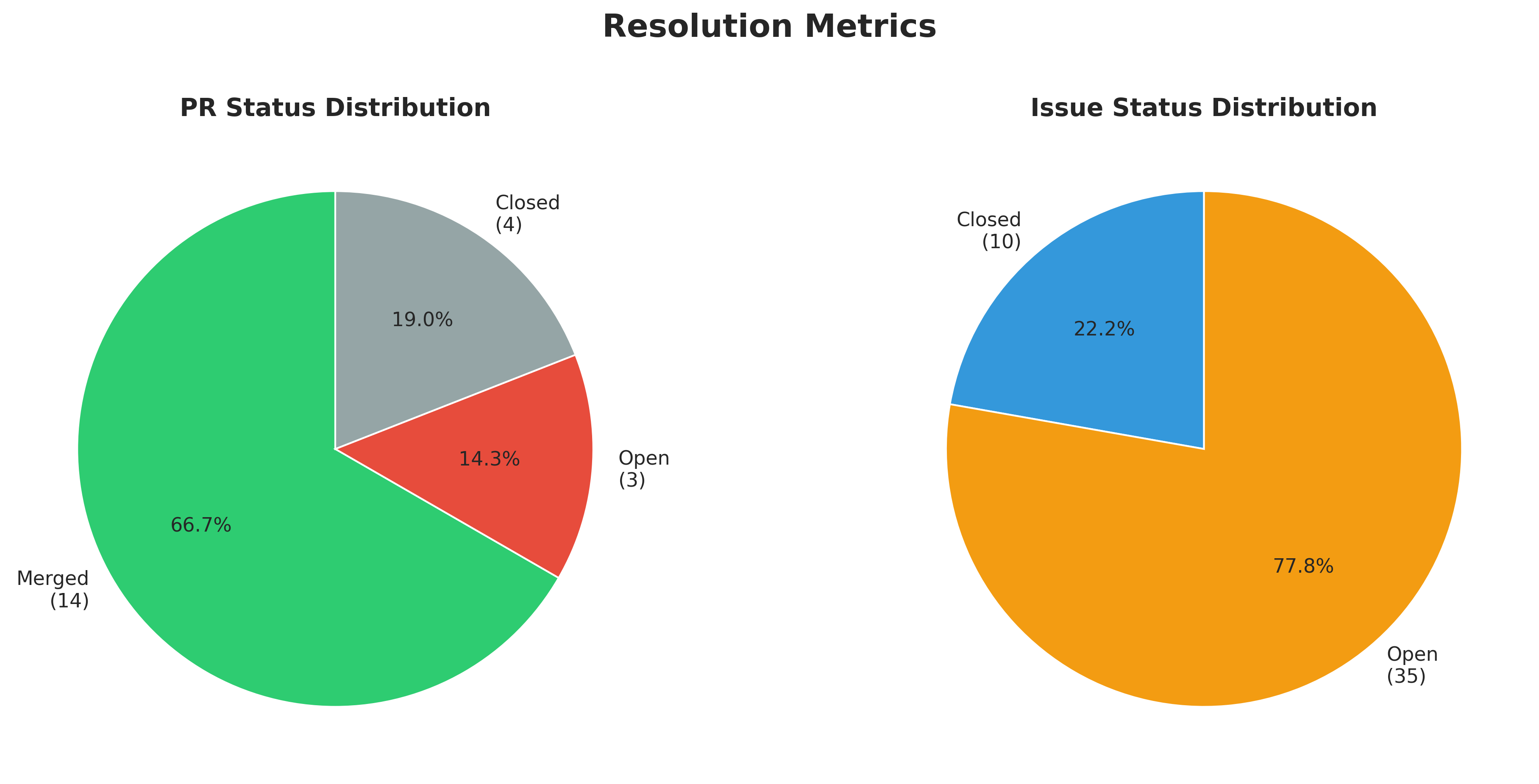 PRs maintain a strong 66.7% merge rate, with 4 closed without merging. Issues show a 22.2% resolution rate — the majority remain open, likely reflecting feature tracking and ongoing work items.