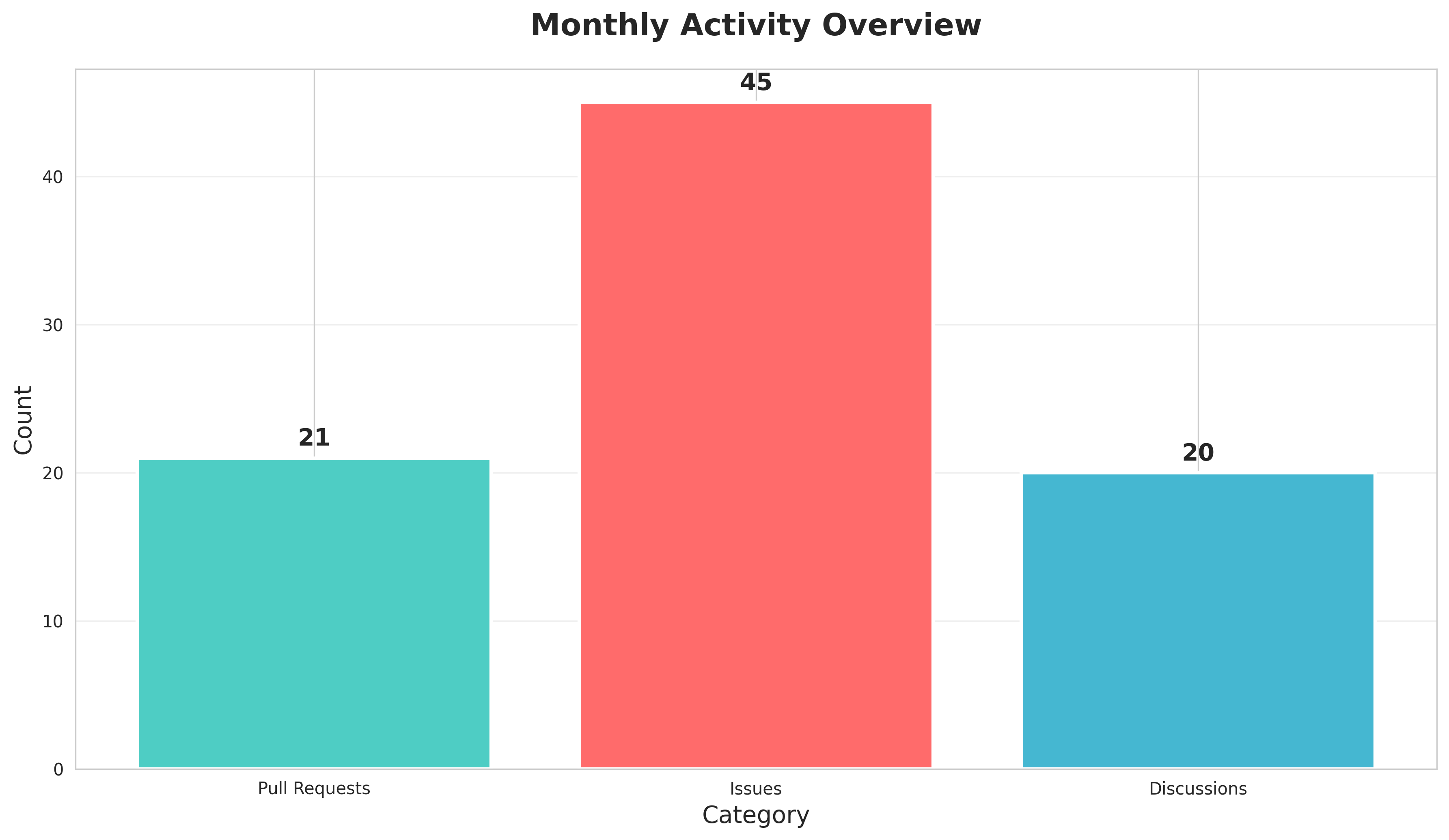 Issues (45) dominate project activity, outpacing PRs (21) by 2:1 — a growing backlog worth attention. Discussions (20) have doubled since yesterday, indicating increased community or team communication activity.
