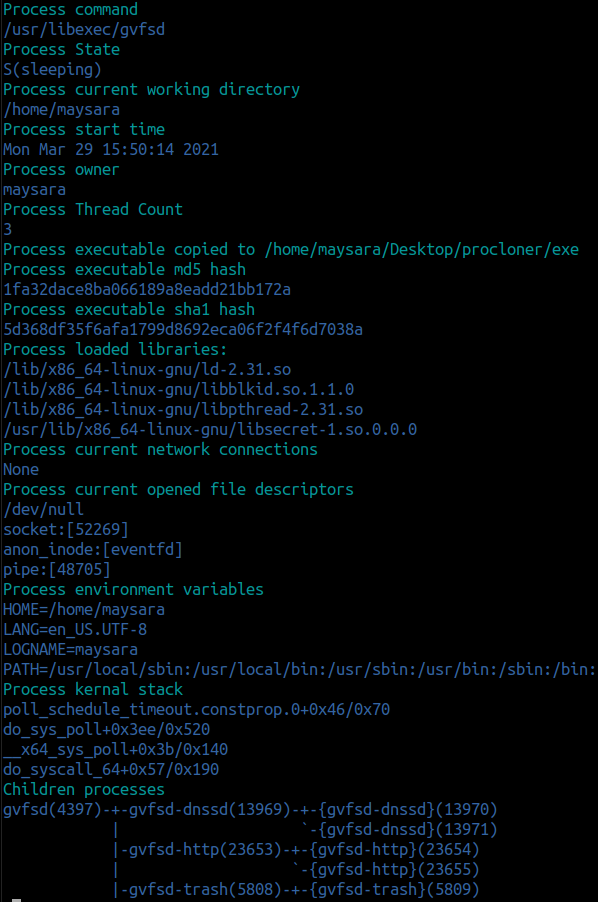 Procloner collects information about a running process.