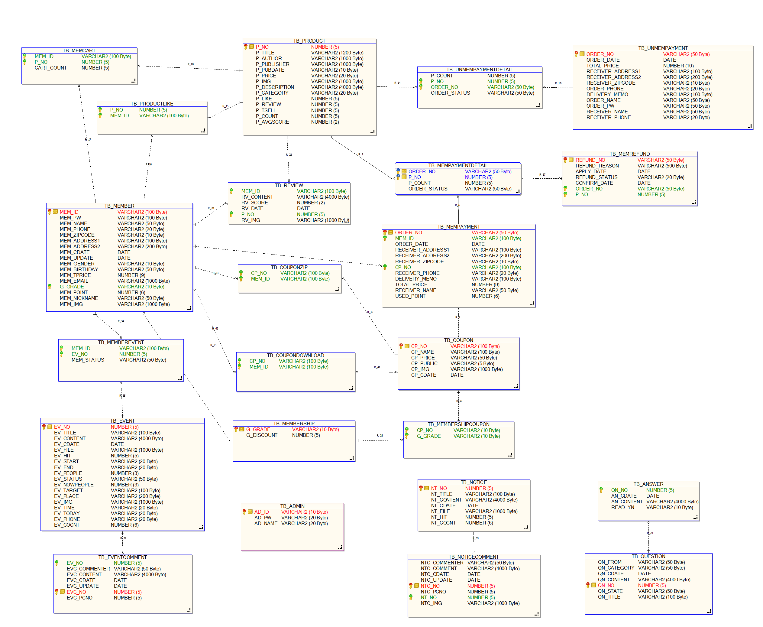 저희 프로젝트의 총 테이블은 23개, 컬럼은 151컬럼으로 구성되어 있습니다.
