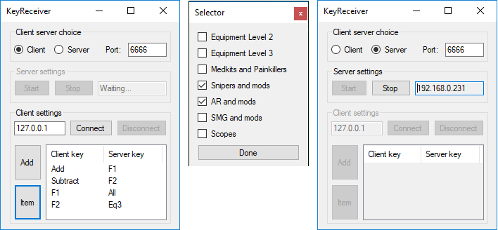 Make sure that at the start of the program (on the server) every item is selected in the client Item Config screen and the Item Config screen is closed. Press the 'Item' button on the client and press a key to which you want to bind your new config. Select the items you want for this config and press 'Done'.