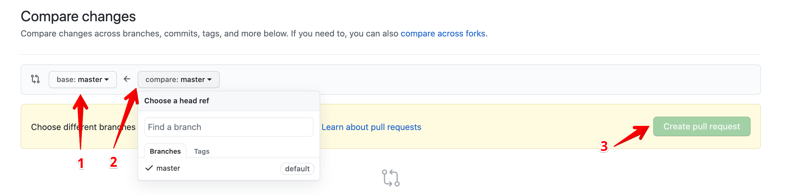 Выбрать в списке base веток master, в списке compare веток свою и открыть PR