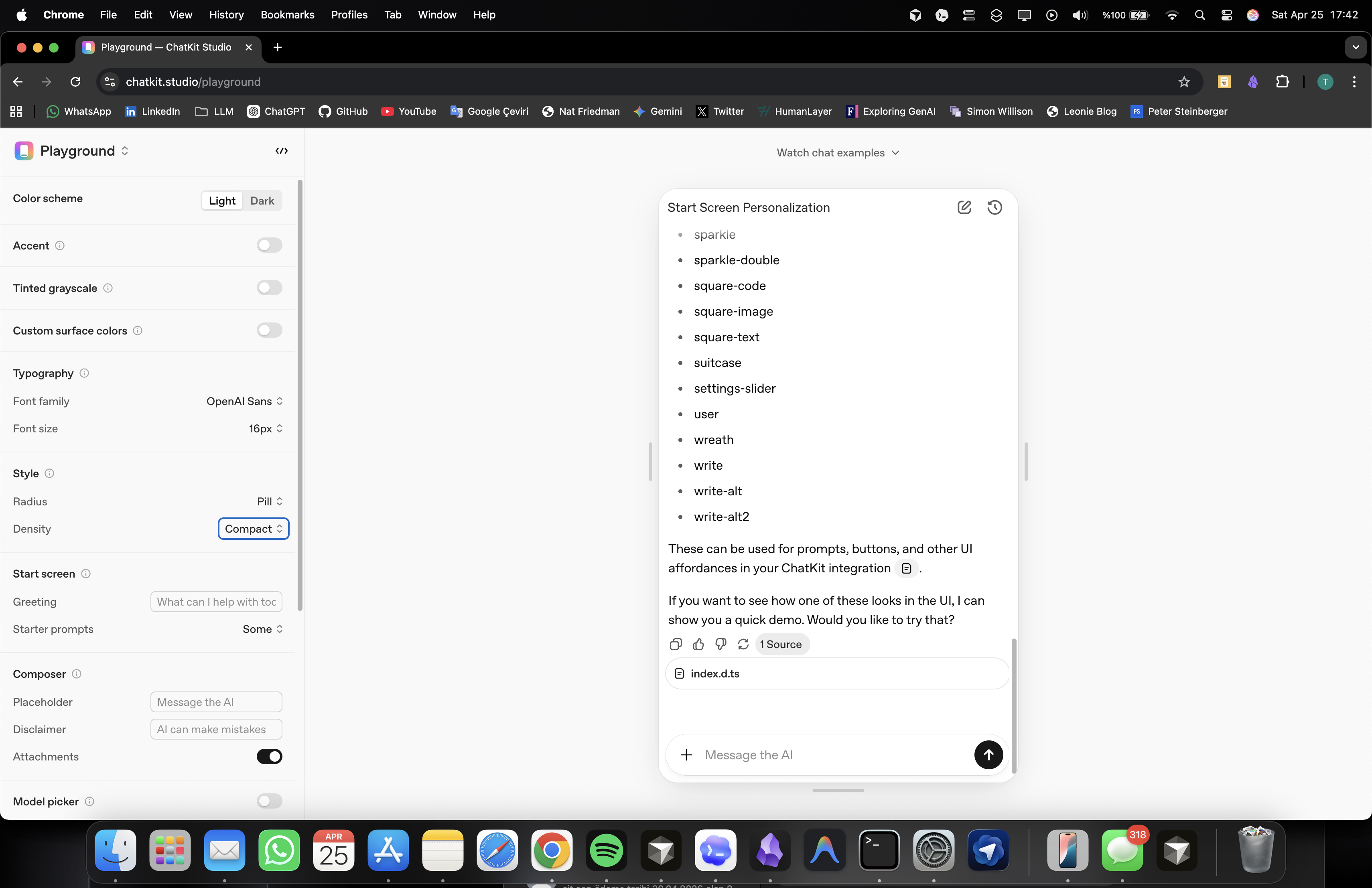 The built-in Sources disclosure/card appears horizontally misaligned with the rest of the ChatKit message layout in the official playground.