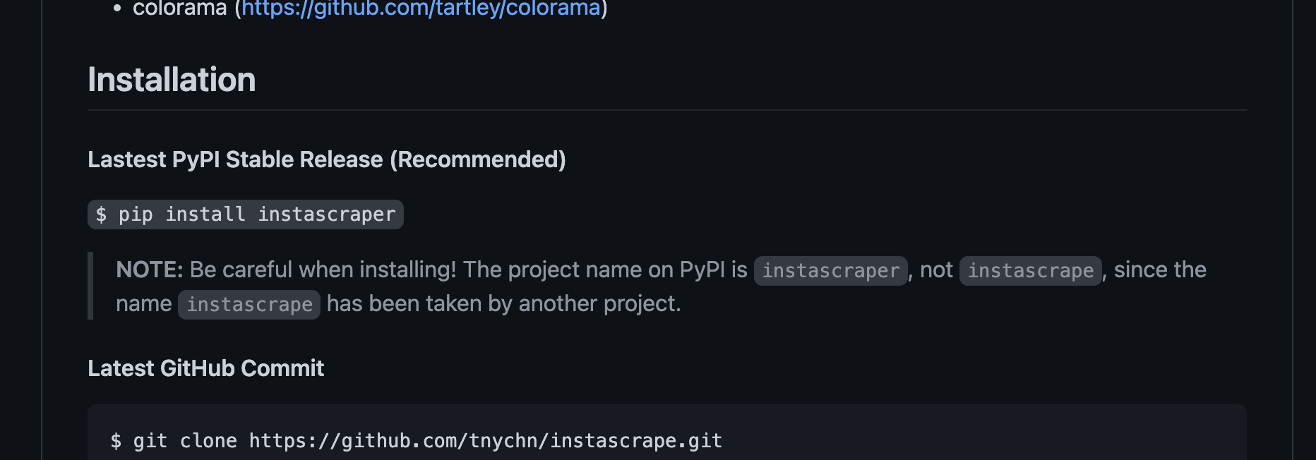 instascrapeas intended, i.e. via the repo's example —— I receive an error