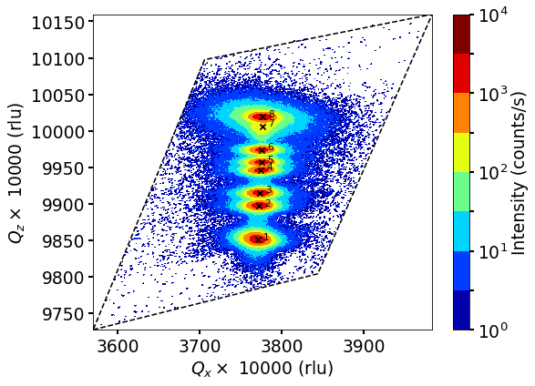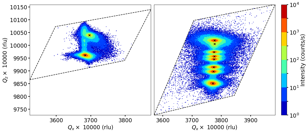 | Detecting sensitive RSM peaks (peak detection at low intesity) | Merged RSM maps (including strain calculations) | Aligning RSM maps using |