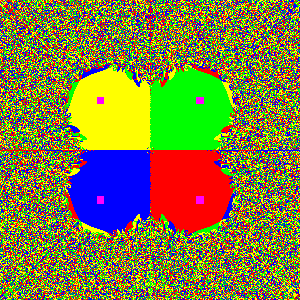 Each purple square is a magnet. Each color represents which magnet it ended up being attracted.