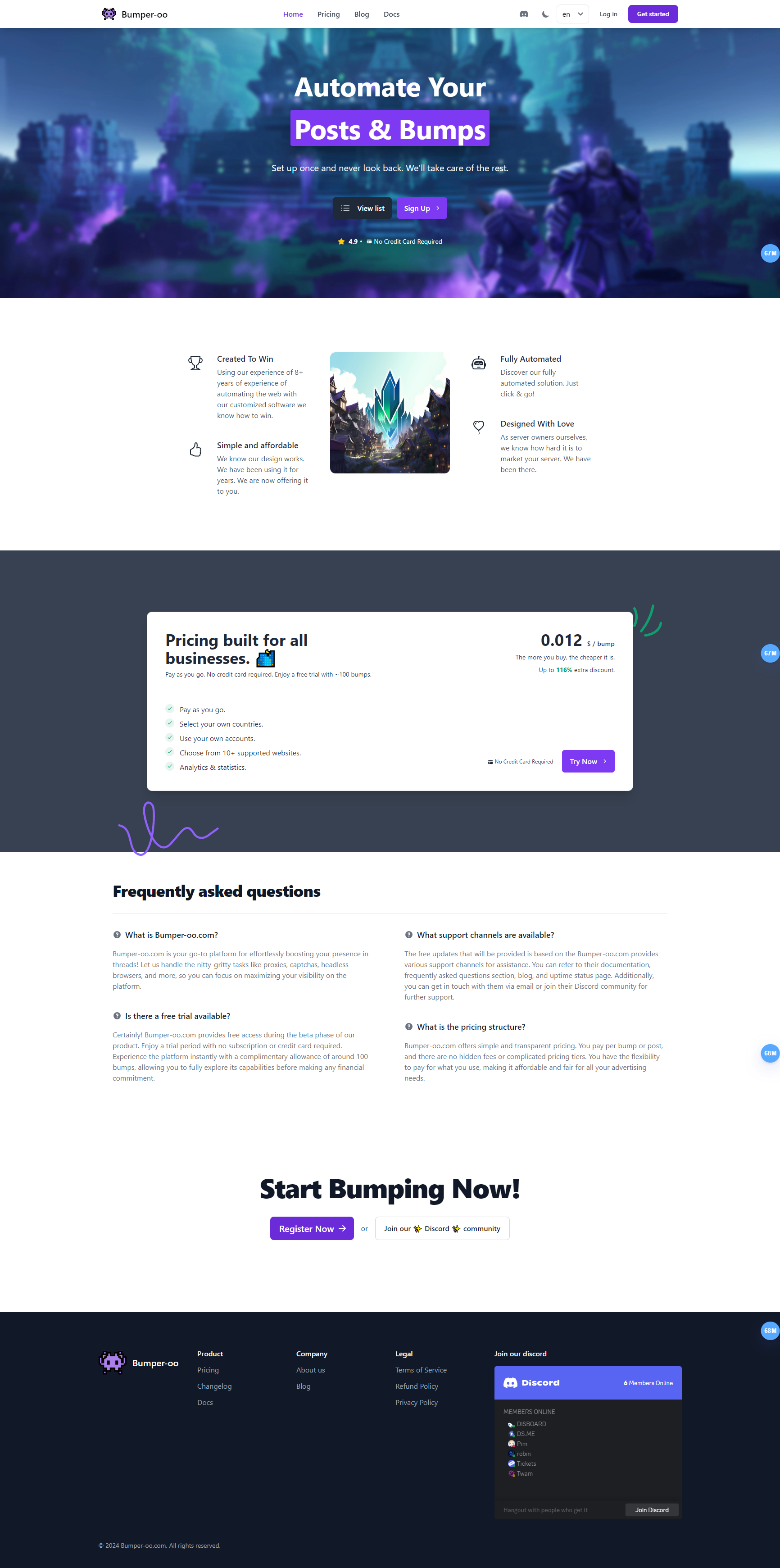 What support channels are available? Bumper-oo.com provides various support channels, including documentation, frequently asked questions, blog, and uptime status page. Additionally, you can get in touch with us via email or join our Discord community for further support.