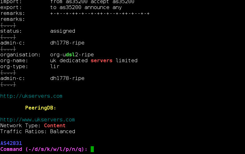./ASkidban.lua decideThis will bring up an interactive console, which will present to you the AS and their whois message in a summarized form (highlighting interesting words, ellipsizing unneded info and gathering URLs), and PeeringDB information. Each ASN is either dunno (blue, undecided), sir (green, good) or kid (red, bad). Your job is to tag dunnos into kids or sirs (so that ASkidban will not ask you about them anymore). Here is a screenshot of how it looks like: