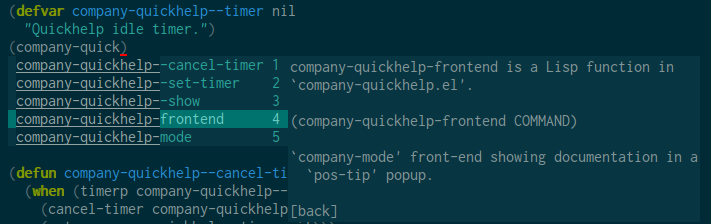 Hi, I'm experiencing an issue on OS X, and other members of the /r/emacs subreddit are seeing it too. I'm using pos-tip with the company quickhelp package. On the github homepage for company quickhelp it shows this image, in which the documentation panel is basically an extension of the company completion menu. What I get instead (on OS X) is a little more disjointed interface that looks like this. It looks like this might be a bug in pos-tip, or potentially a setup issue. Are there settings I can change that will allow pos-tip to present documentation in a way that better integrates with the company completion menu?