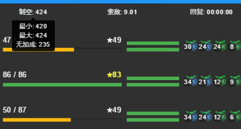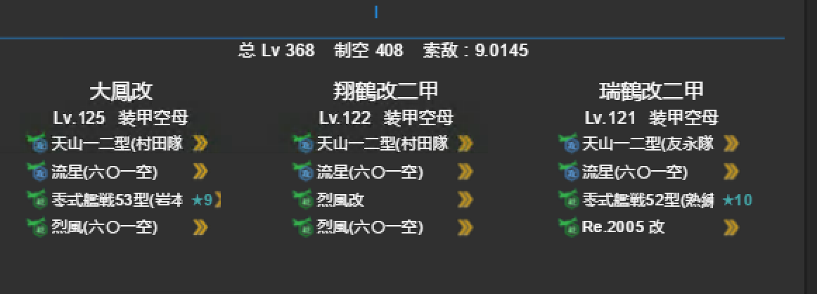 如图,在舰队详情里看到的是424,插件里看到的就是408,舰战一颗星+0.2对空,估算一下改修影响2*sqrt(搭载),差值基本就是15~16: 外部舰队详情(所有飞机满熟练度,052那个大概是太长了显示不下):  插件内的显示:
