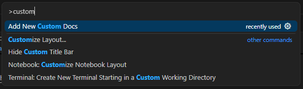 CTRL+SHIFT+P(orCMD+SHIFT+Pon Mac) and we're going to type "custom doc" into the search bar. -