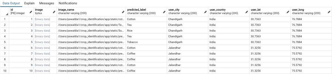- The labels predicted by the model, Information regarding the crop and user's geolocation information (at the time of upload) are also added to the database.