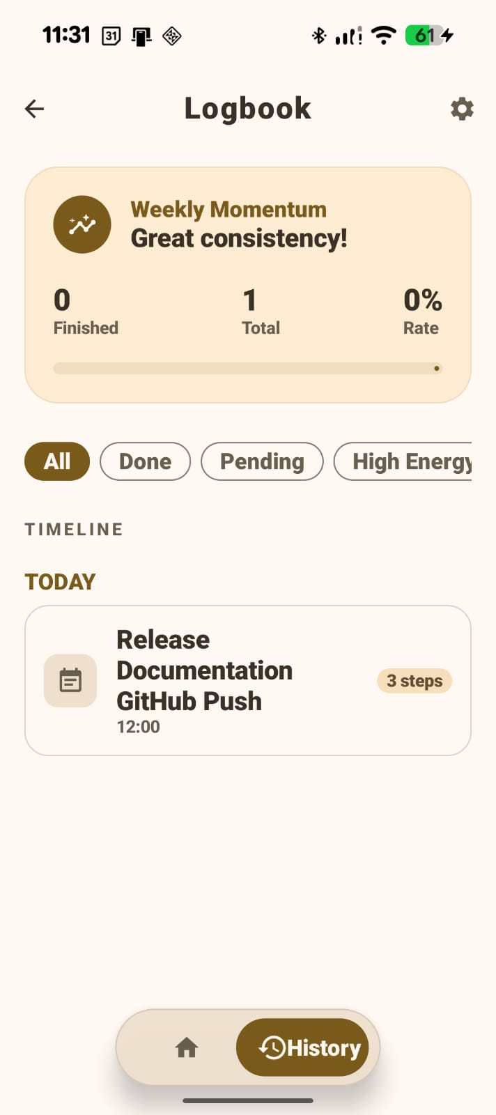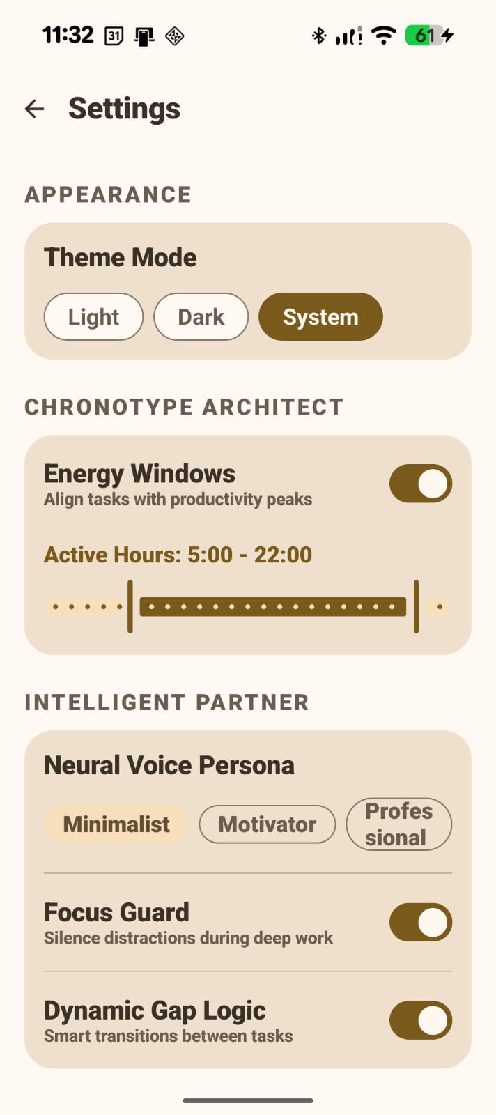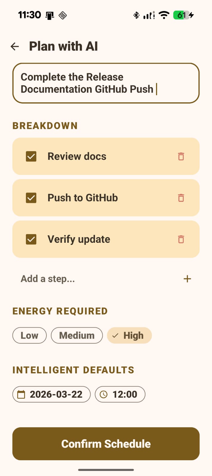 - Energy-Aware Slots – Tasks are intelligently placed in your day based on your energy levels (Low, Medium, or High).