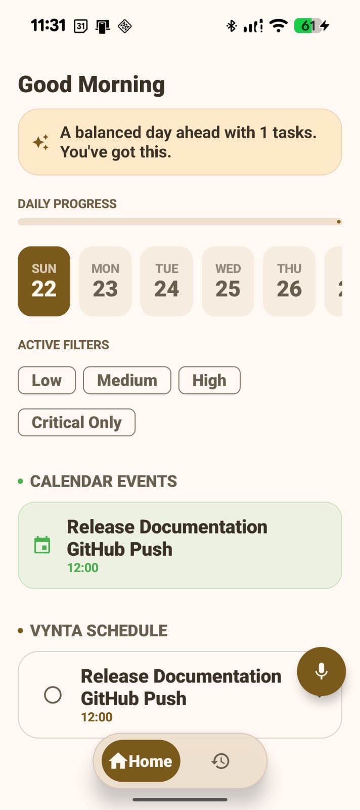 - AI Task Scheduling – Simply type or speak your task. Vynta uses Groq (Llama 3) to automatically determine the duration, priority, and energy level.