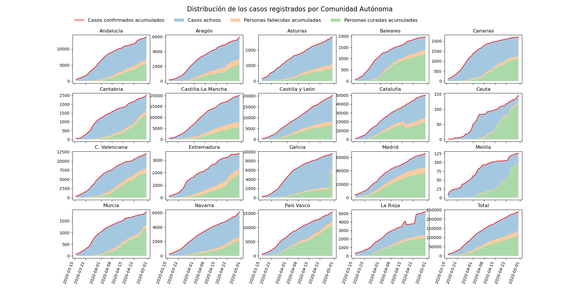 - Distribución de los casos confirmados acumulados: muestra la proporción de casos activos, fallecidos y curados para cada Comunidad Autónoma.
