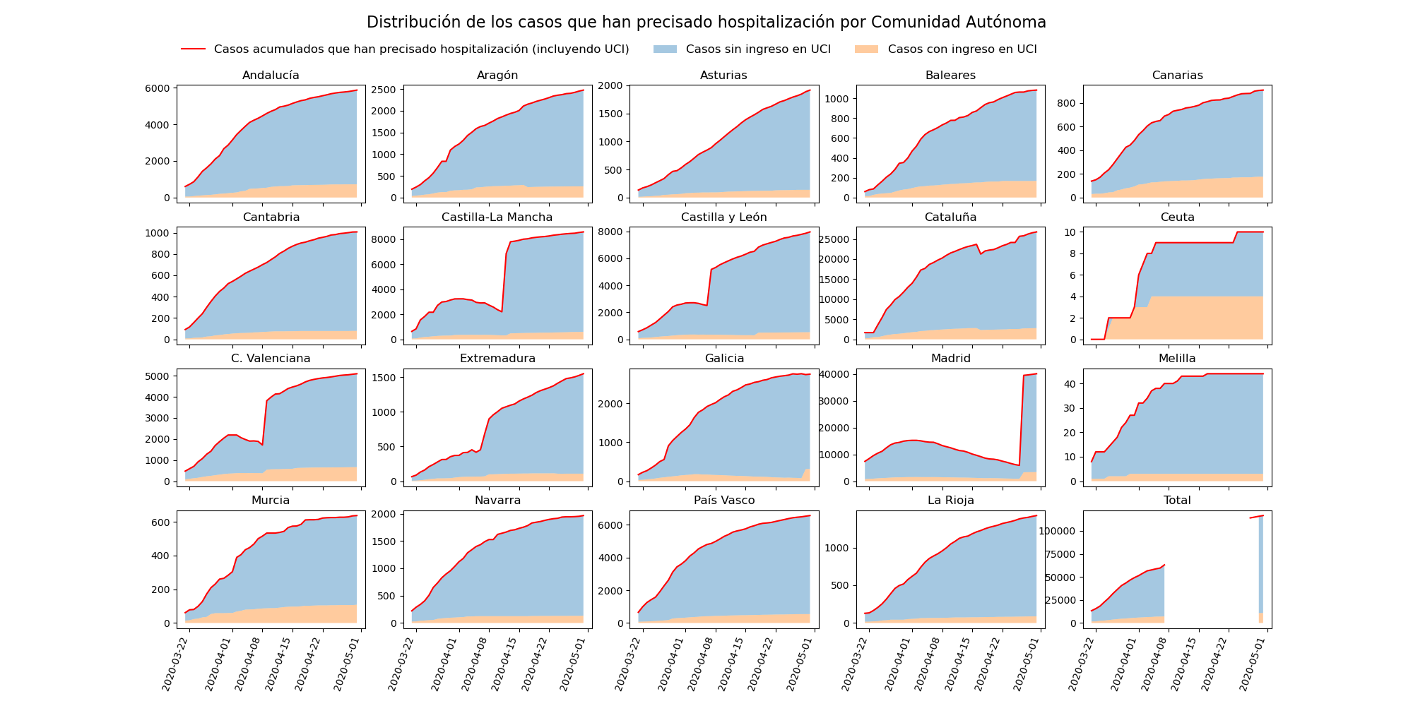 - Distribución de los casos acumulados que han precisado hospitalización: muestra la proporción de casos que han necesitado ingreso en la UCI para cada Comunidad Autónoma.