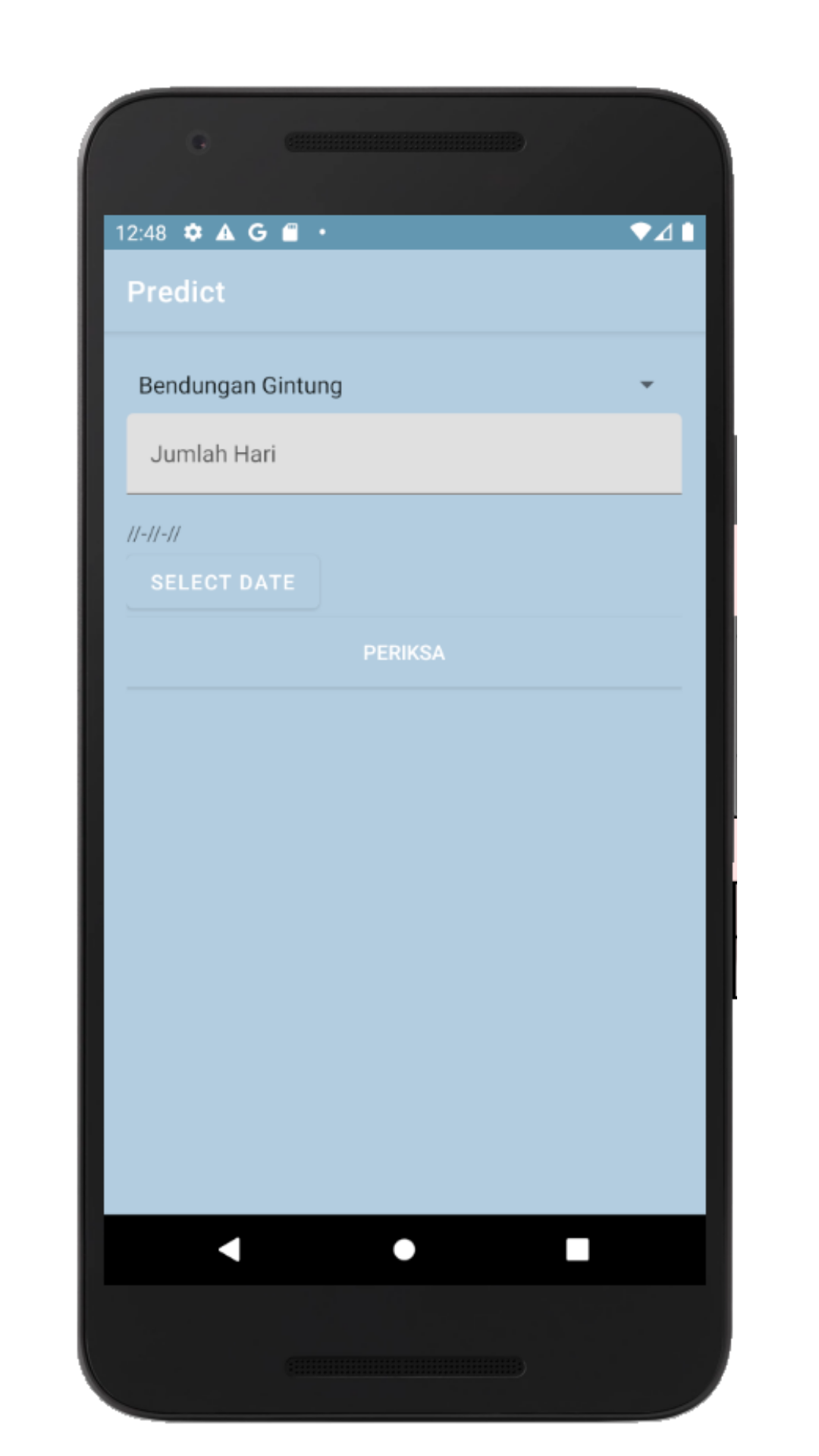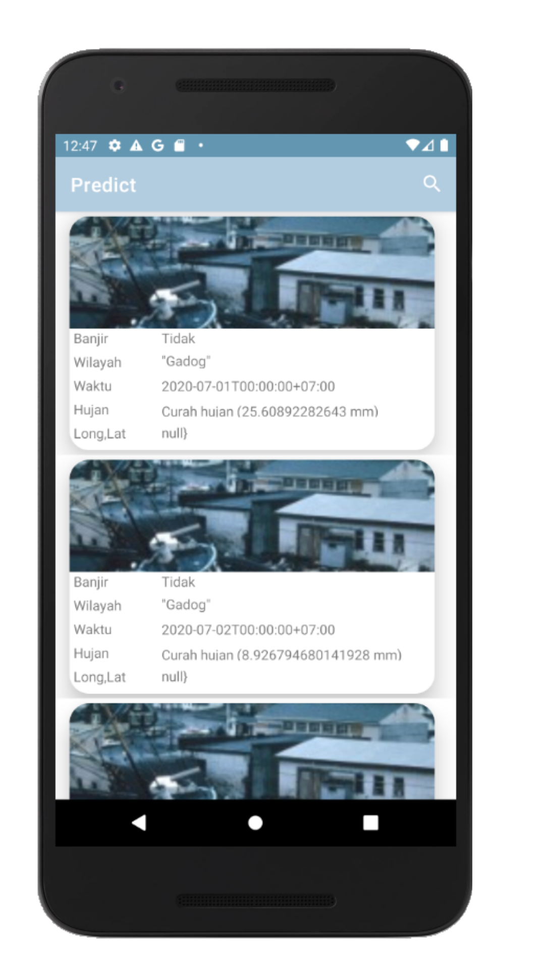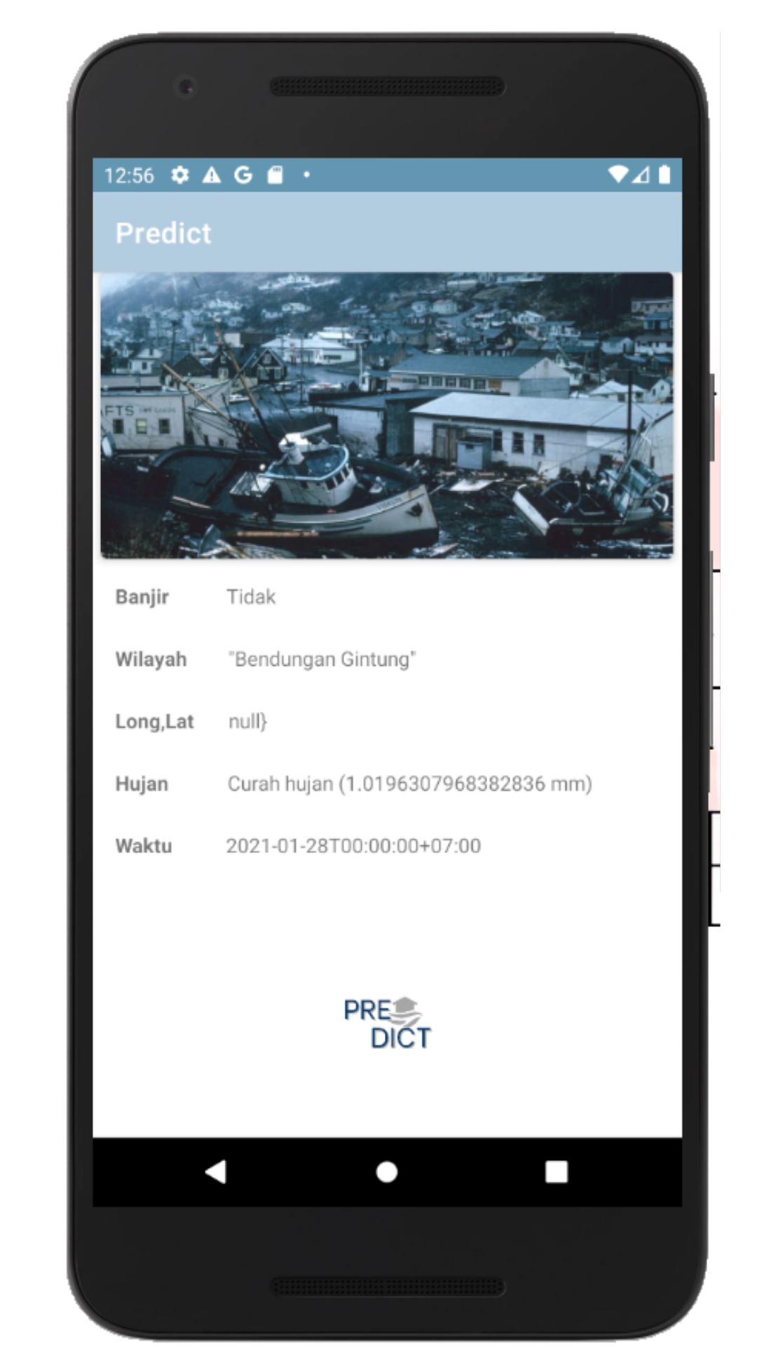 This application is an application that you can use to predict floods, simply by entering the location, the number of days and the date. Then the application will provide some predictions that might happen .