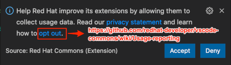 - ASSERT: vscode-redhat-telemetry asks you if you want to accept or deny telemetry.