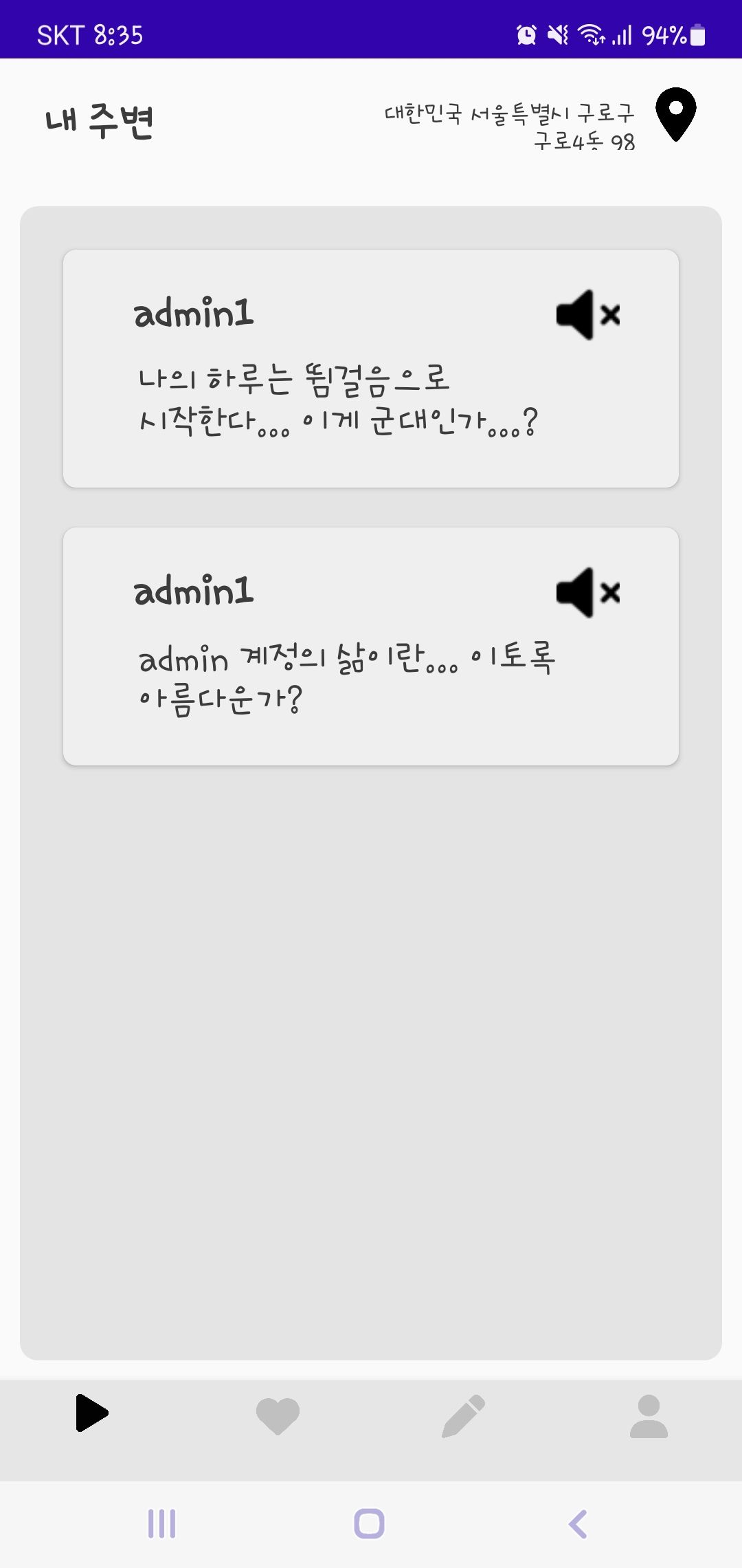 내 위치를 기준으로 주변사람들의 글이 보이는 화면