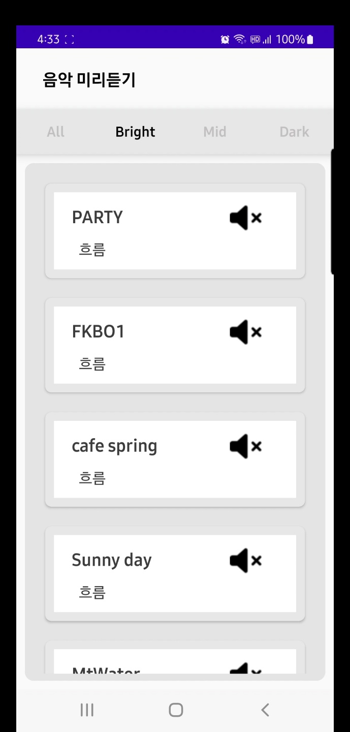등록된 음악들을 미리 들어볼 수 있는 화면