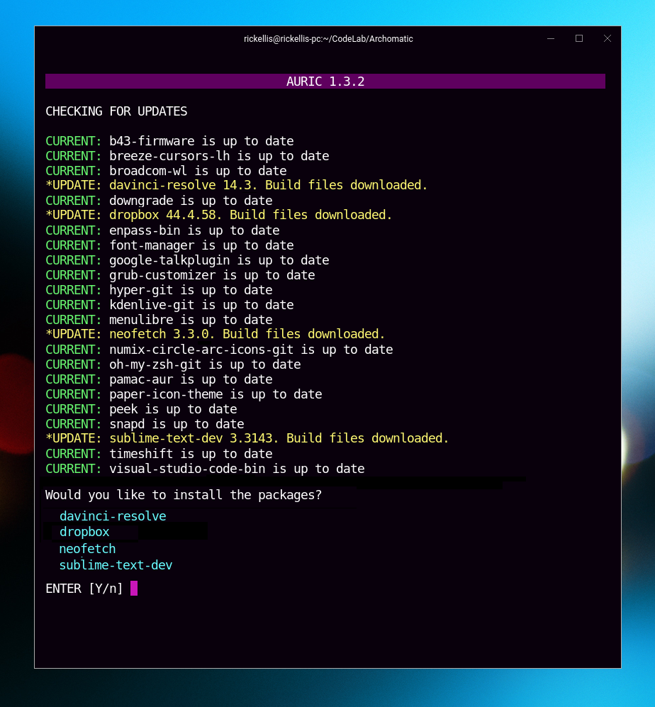 Should you use AURIC? If you are happy with your current package manager then probably not. If you are looking for a simple tool that helps automate the tasks you are already comfortable doing then you might give it a try.