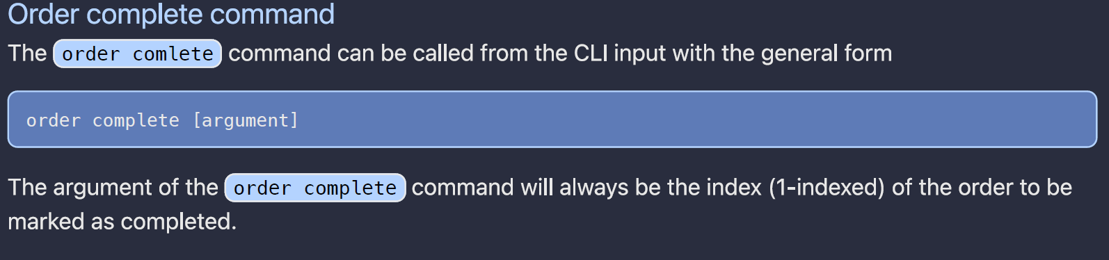 Order complete is misspelled in the developer guide.  <!--session: 1618552222408-a60ac370-25e9-418d-b60d-94211f89c2fd-->