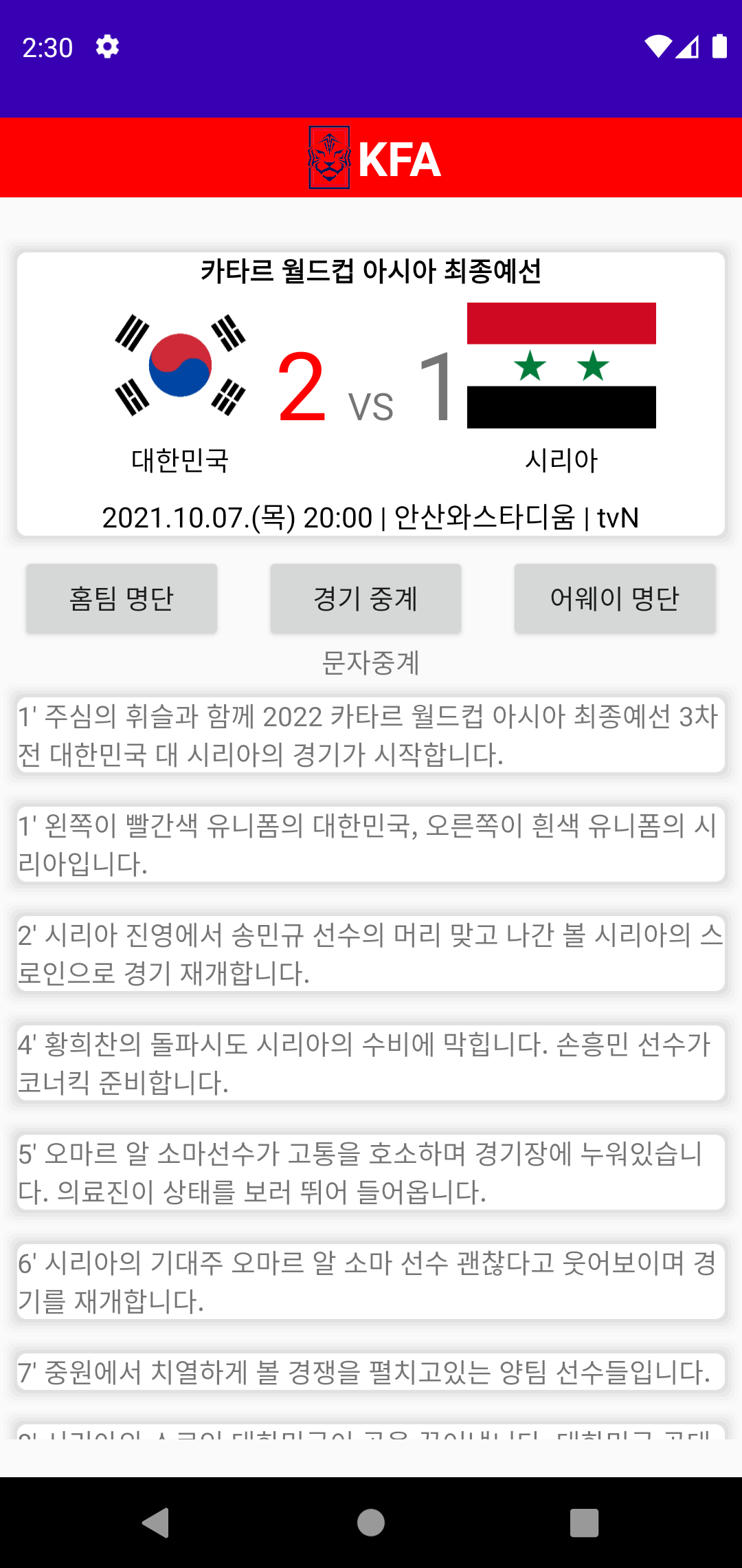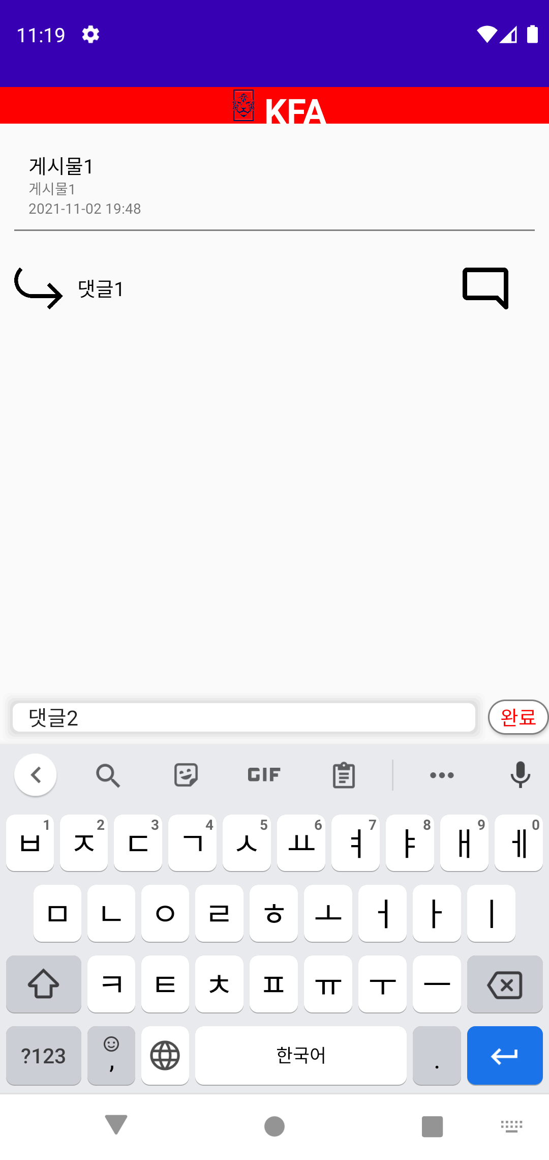 한국축구 국가대표 문자중계 어플리케이션 사용기술 개요 공식 KFA 공식 어플리케이션이 이미 있지만 대다수의 사람들이 사용하기에는 큰 기능이 없다. 한 공간에서 축구를 좋아하는 사람들과 소통하고 국가대표 경기 내용을 어플로 받아볼수있게 구현했다. 화면구성 Main Game_Info Depth Community Post&Reply postUpload 자세한 내용 여기를 클릭하세요.