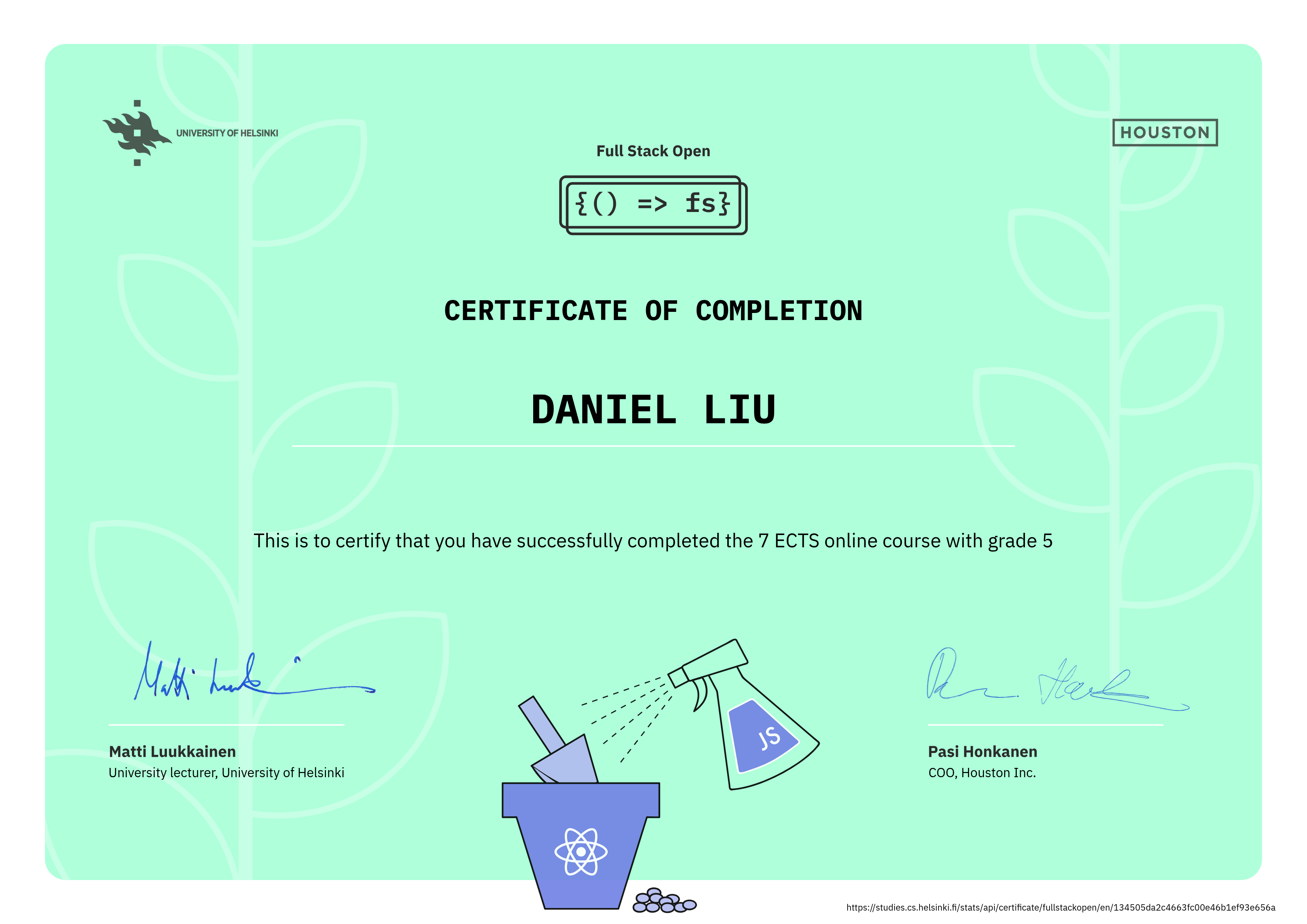 Certificate of completion Fullstack Open Course from the University of Helsinki