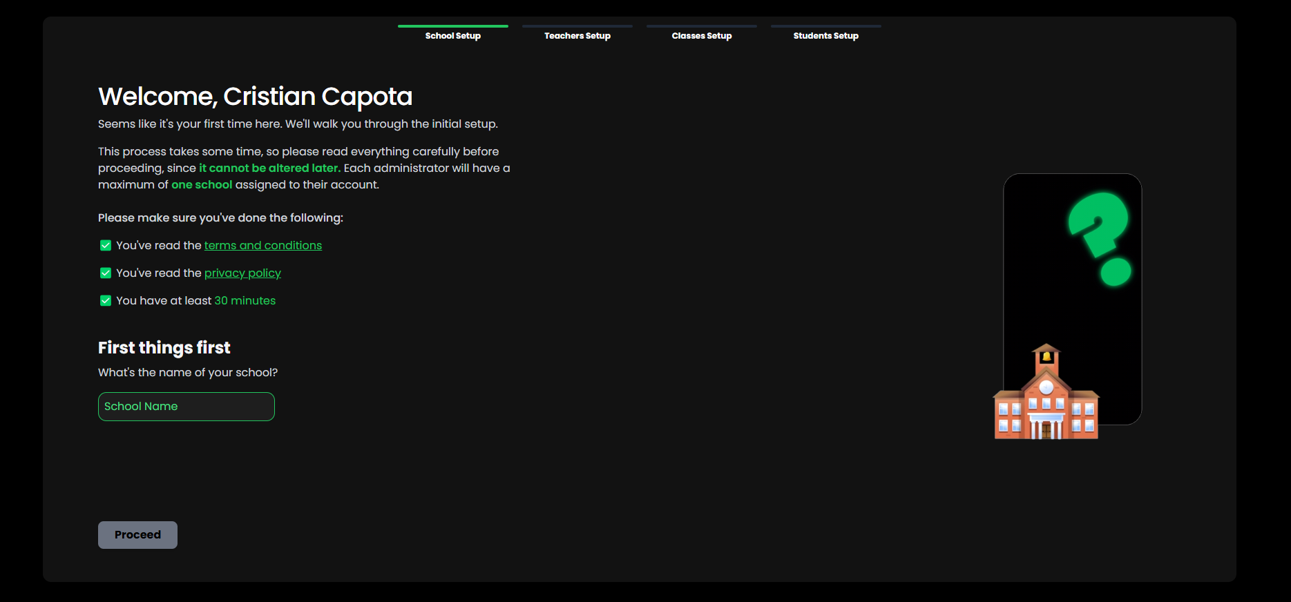 Admins: Upon signing up, users will receive Admin accounts. Admin users are guided through an intuitive setup interface.