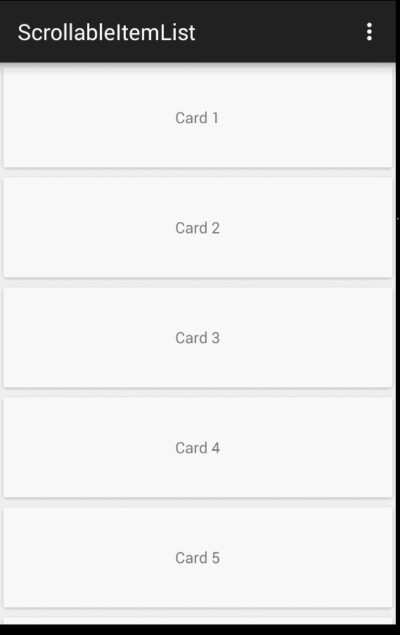 The view has been created using standard views now available with Android Lollipop and its compatibility libraries. The list is a RecyclerView with a LinearLayoutManager. Each item in the list is essentially a ViewPager with two views; a CardView and FrameLayout with three buttons.