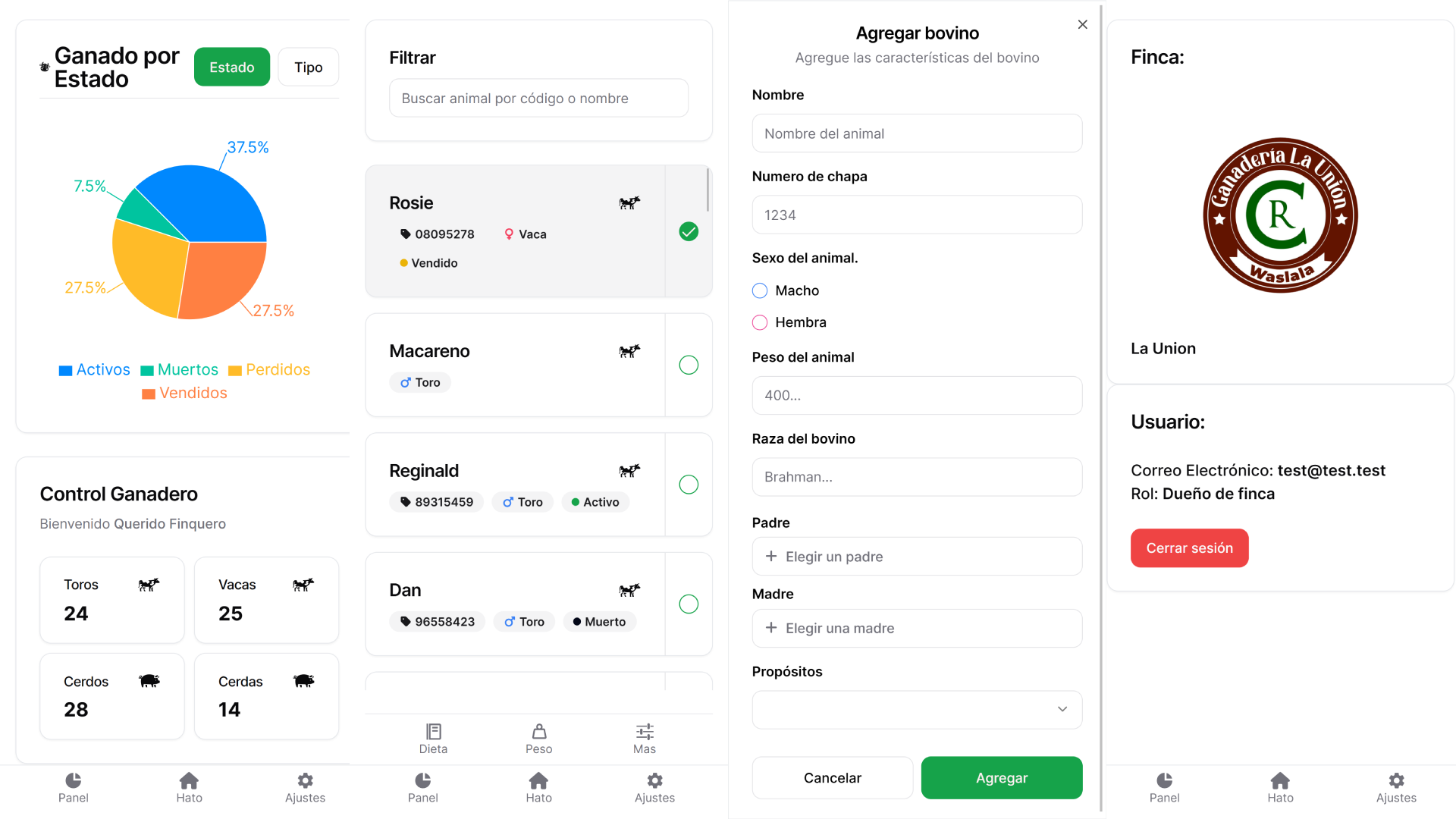 GanaTech is a web application for managing both cattle and swine herds, aimed at facilitating and enhancing farm management using innovative technologies. The application offers intuitive tools for both administrators and workers. It includes functionalities for registering animals, monitoring status changes, tracking herd movements, and providing current statistics. All these features collectively assist producers in making informed and efficient decisions.