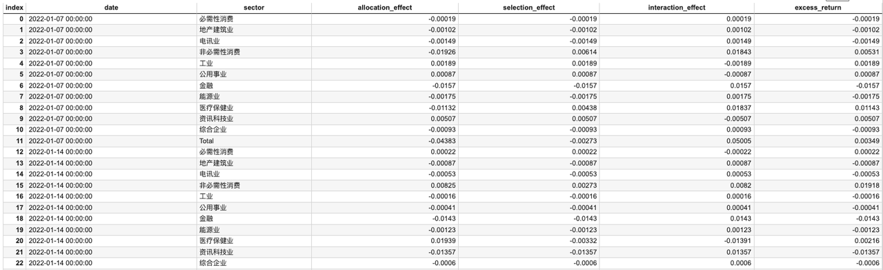 brinson_model = pd.DataFrame(columns=['date', 'sector', 'allocation_effect', 'selection_effect', 'interaction_effect', 'excess_return'])