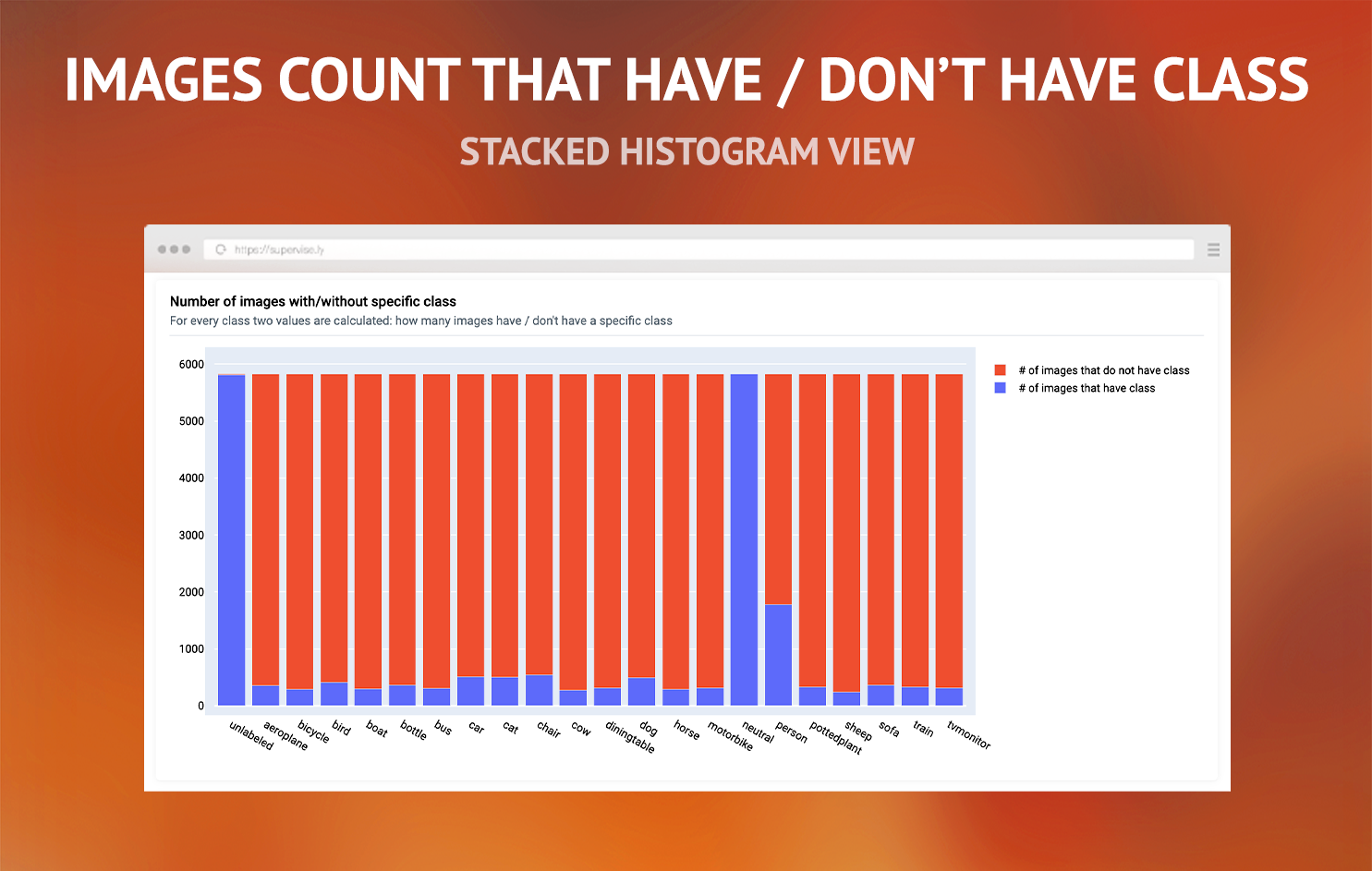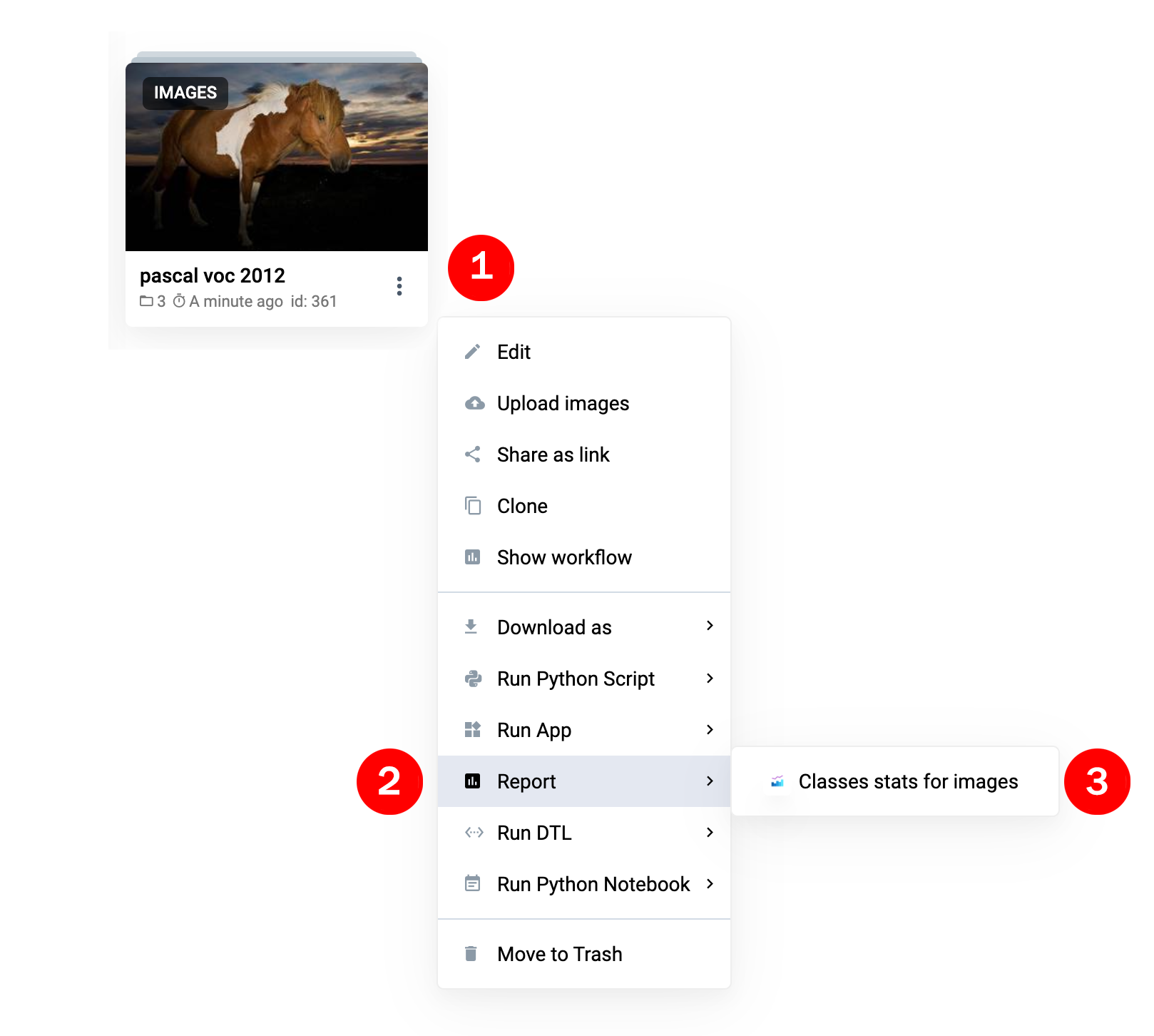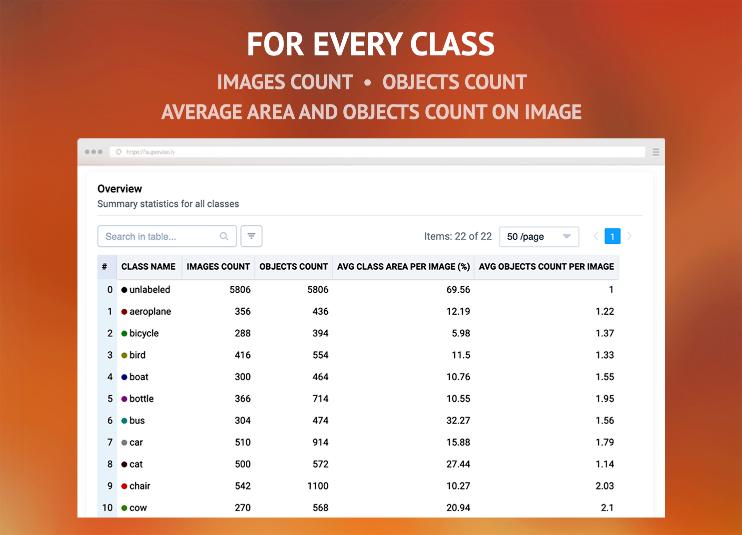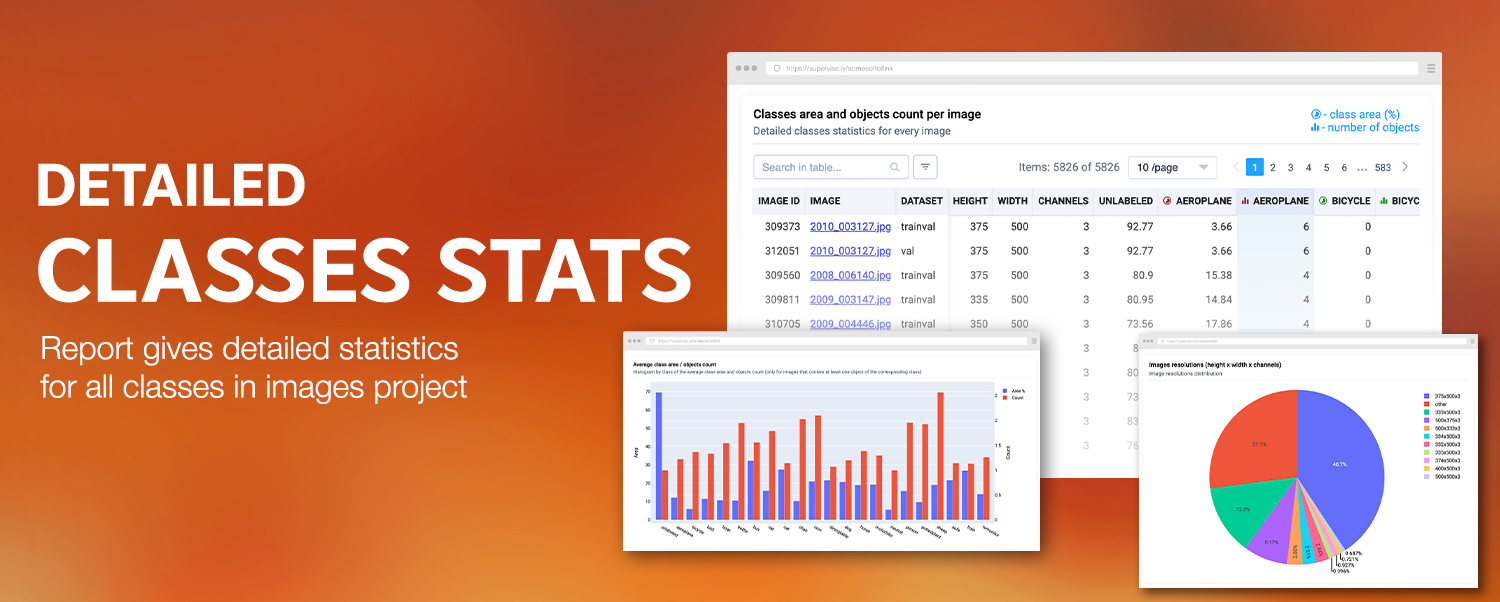 This app "Classes Stats for Images" generates report with detailed general and per image statistics for all classes in images project. It allows to see big picture as well as shed light on hidden patterns and edge cases (see How to use section).