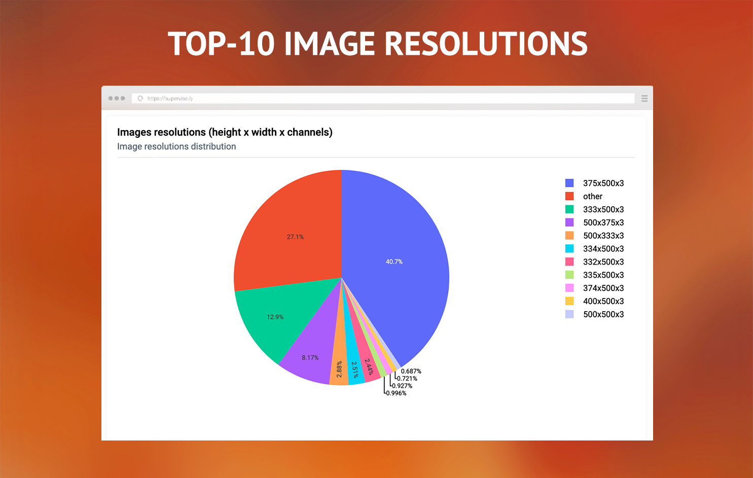 IMAGE ID- image id in Supervisely InstanceIMAGE- image name with direct link to annotation tool. You can use table to find some anomalies or edge cases in your data by sorting different columns and then quickly open images with annotations to investigate deeper.HEIGHT,WIDTH- image resolution in pixelsCHANNELS- number of image channelsUNLABELED- percentage of pixels (image area)