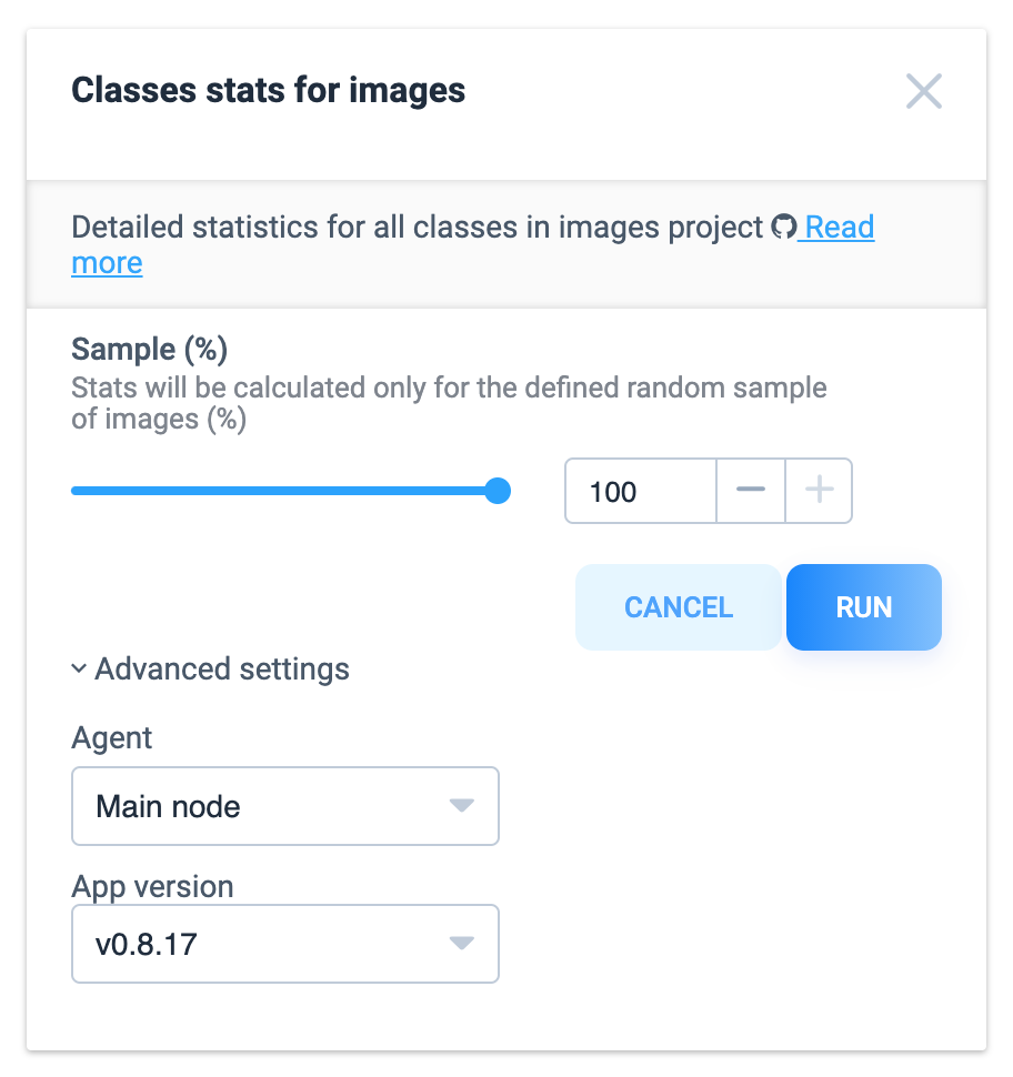 Choose the percentage of images that should be randomly sampled. By default all images will be used. And then press "Run" button. In advanced settings you can change agent that will host the app and change version (latest available version is used by default).