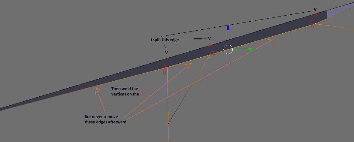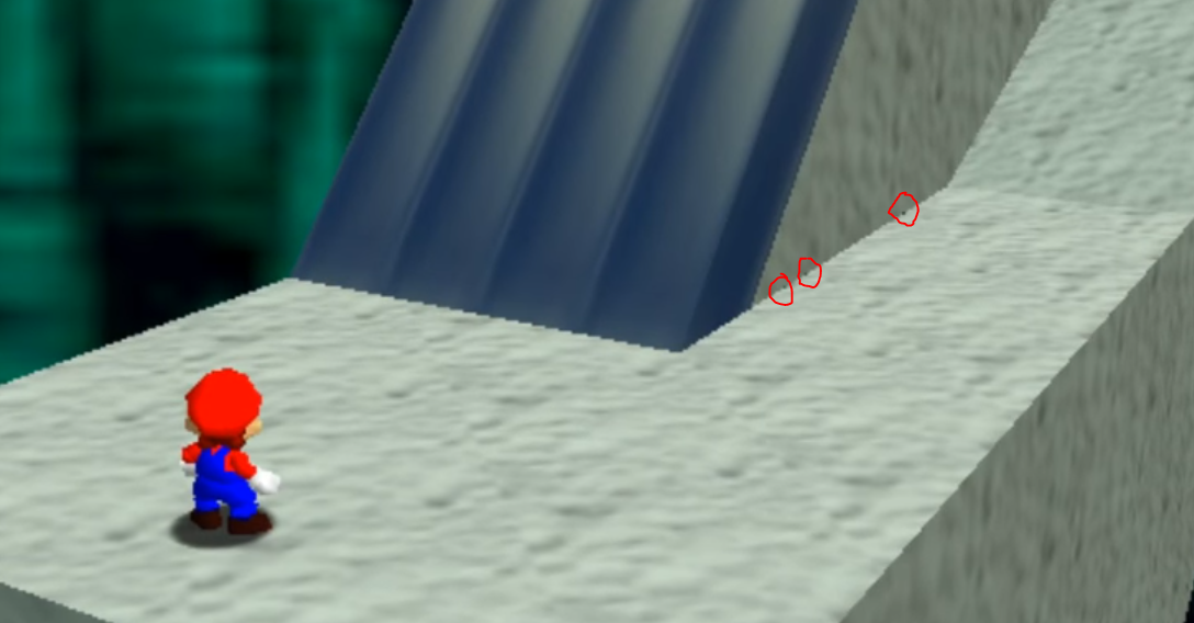 Fun fact: Even Super Mario 64 has a lot of T-Junctions everywhere. Probably to reduce the polygon count. It's the same problem we are currently facing: For clarification this is how they did it for that edge to be a T-Junction. Not splitting that quad at the vertex the arrow points to saves 2 triangles but you get the glitchy edge (as if you were to lift up that vertex you see a hole with the skybox like in my disassembled image above this post, which the GPU is doing slightly due to floating point precision errors). |