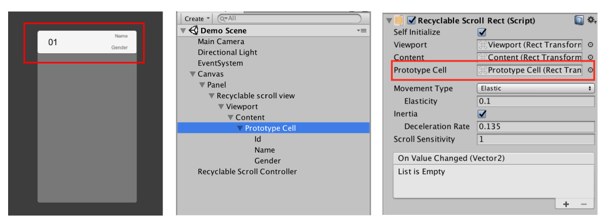 3. Cell class: Once you create your desired Prototype cell, assign it to the Recyclable Scroll Rect component. Now you will need to create a Cell script and attach it to the Prototype Cell. This script must be a Monobehaviour implementing ICell interface. The purpose of a Cell script is to configure the cell as the list is scrolled or updated. You must keep reference to the UI items that are required to be updated according to your data source. Check DemoCell class for reference