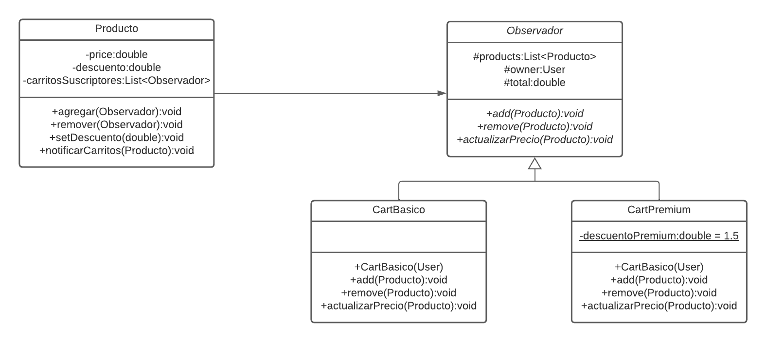 SOLUCIÓN: Utilizar el patrón Observer, ya que permite definir un mecanismo de suscripción para notificar a varios objetos sobre cualquier evento que le suceda al objeto que están observando. Es decir, cada que el precio de un producto se vea afectado por un descuento, instantáneamente los carritos de compra donde se encuentre este producto, calculen su precio total considerando el nuevo precio.