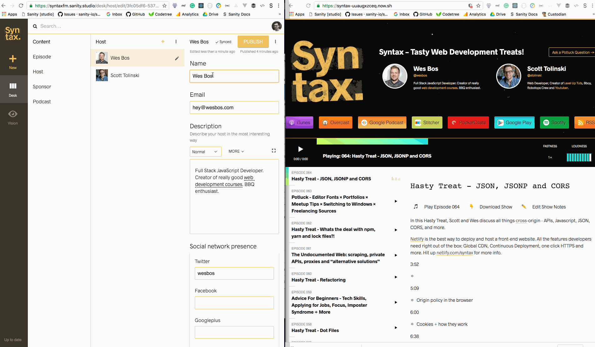 This is an alternative version of the syntax.fm frontend that uses sanity.io as a backend. You can find the Sanity Studio in this repo. And get the data in your own project by running this migration CLI. The studio will work well with other podcasts too.