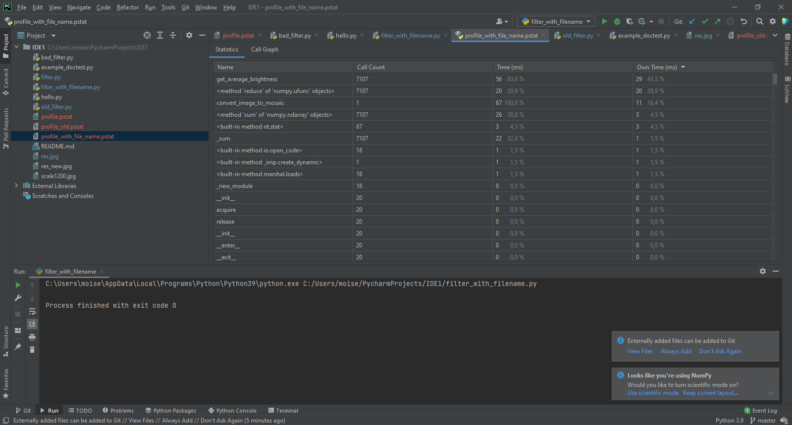 - Запустите с помощью встроенного профилизатора в PyCharm ваш новый filter.py, сделайте скриншот со временем выполнения.