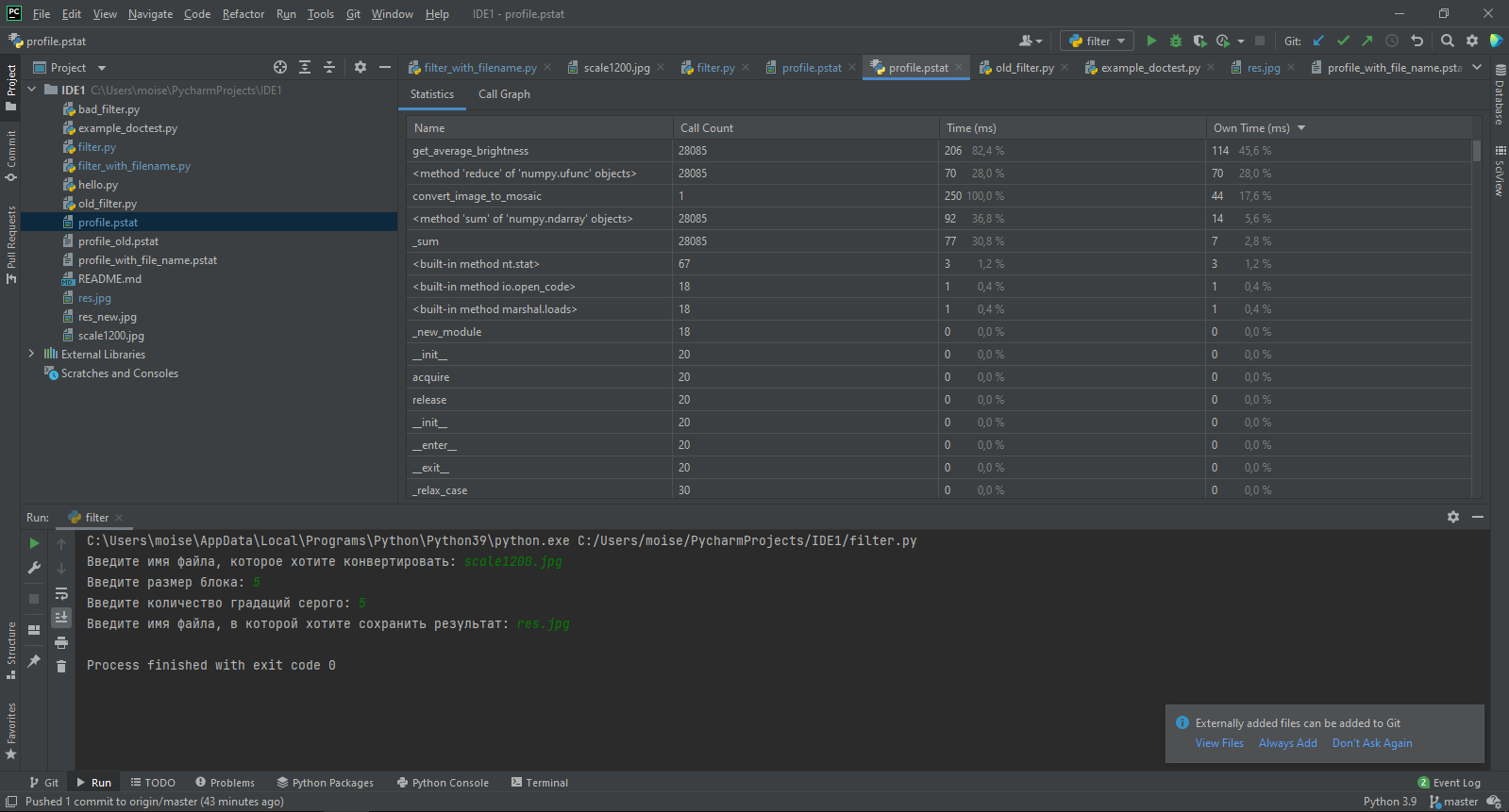 - Поскольку в вашем файле большая часть времени выполнения затрачивается на ввод данных пользователем, поэтому создайте копию вашего файла filter_with_filename.py, добавьте его также в репозиторий, в котором сразу в код введите имя изображения для конвертирования, а также аналогичные параметры для конвертирования, которые указаны были в первоначальном old_filter.py, а именно размер блока 10 и 50 градаций серого. Также закомитьте полученные правки и отправьте их на сервер.