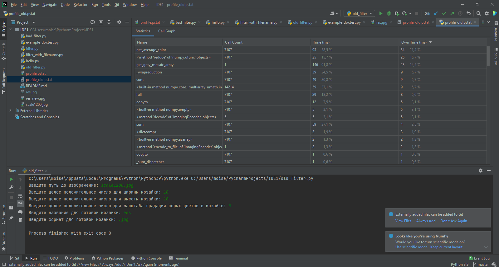 - Также запустите в профилизаторе old_filter.py. Посмотрите разницу во времени выполнения кода. Полученные скриншоты со временем выполнения с объяснением результатов поместите в файл README.MD