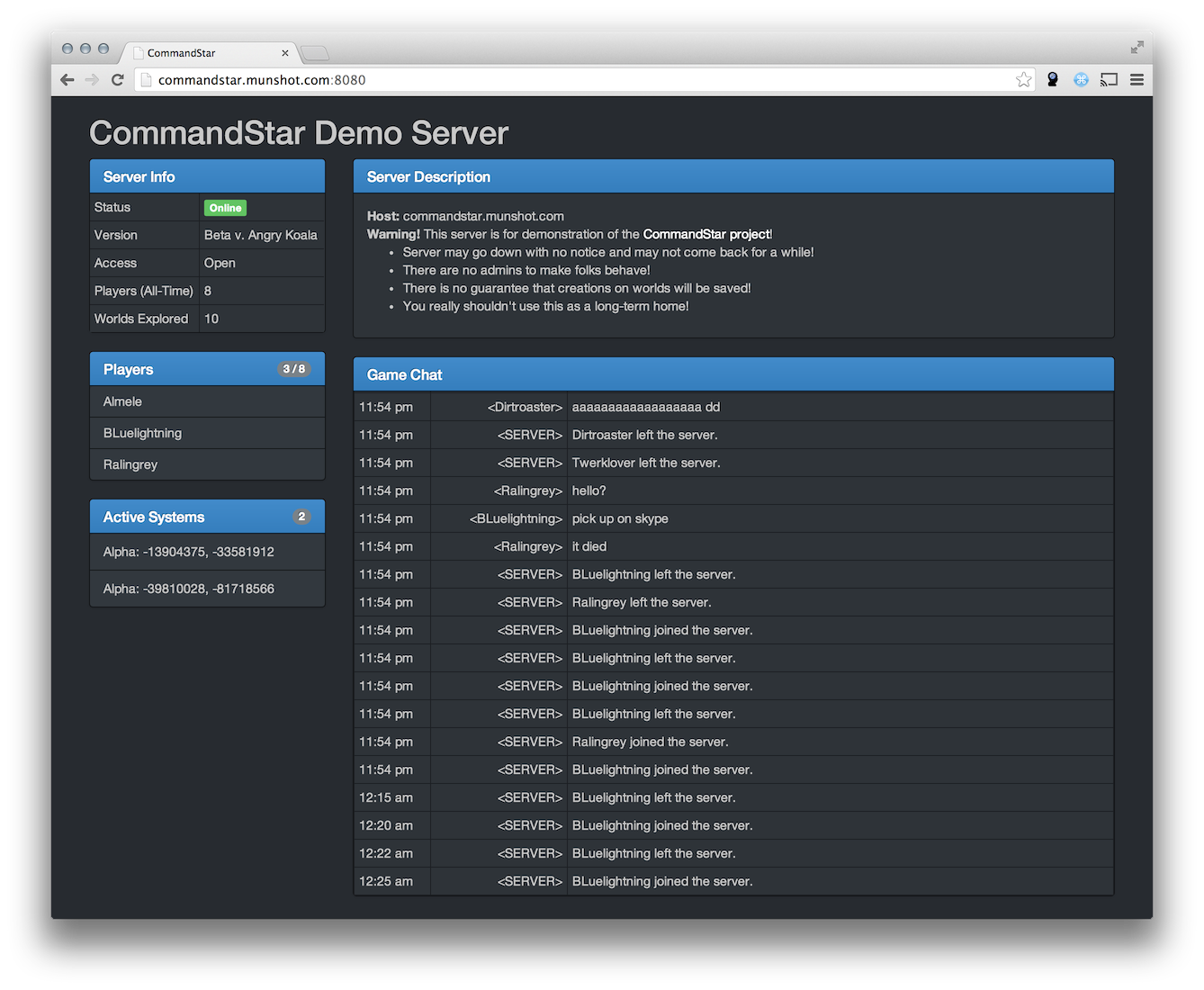 Also note that CommandStar plays nicely with other server tools as it runs completely independently of the Starbound server (and server wrappers).