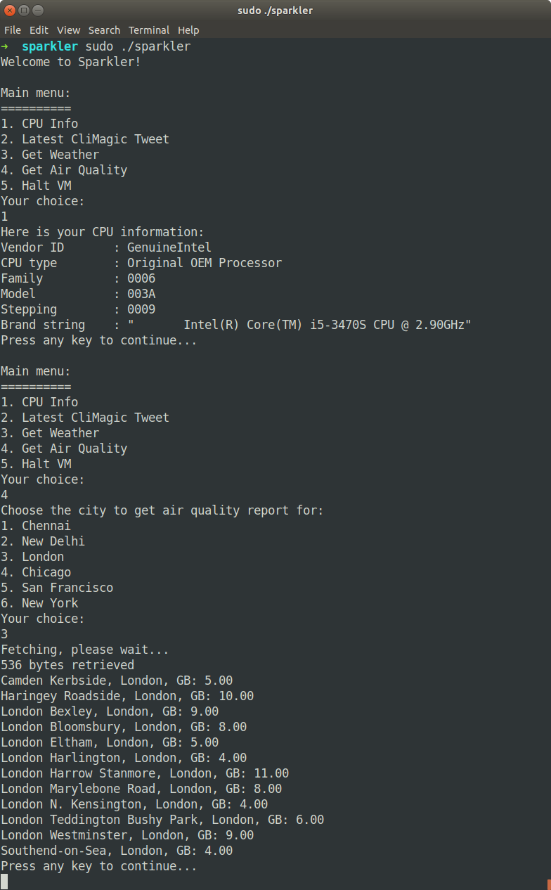 Welcome to Sparkler, a virtual machine monitor and a tiny "operating system" to go with it. When you start Sparkler, it creates a virtual machine using the Linux's KVM API. It is written in C and emulates the following devices: