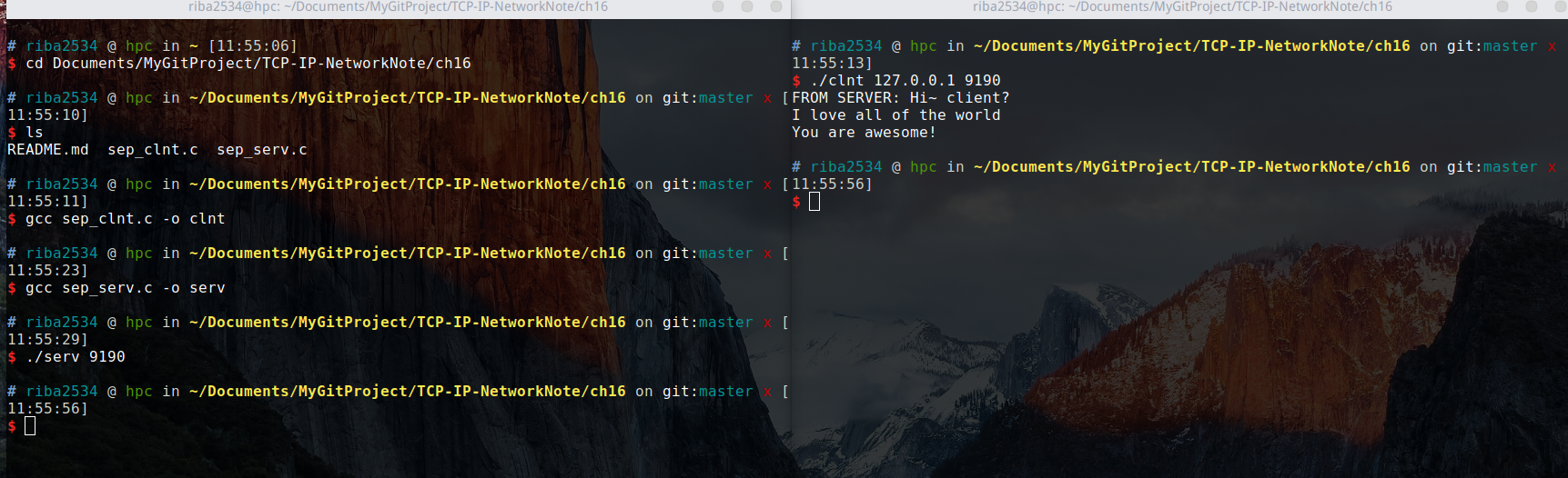 ./hclient 127.0.0.1 9190运行的时候,首先再 9190 端口启动服务,然后 heserver 就会一直等待客户端进行响应,当客户端监听位于本地的 IP 为 127.0.0.1 的地址的9190端口时,客户端就会收到服务端的回应,输出Hello World!